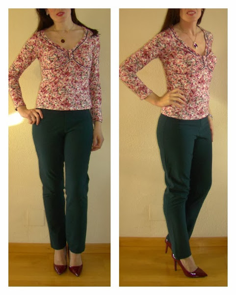 Al igual que Rosy le he añadido una tira de tela en el escote, para poder evitar que el escote tenga vida propia y le he añadido un piquillo elástico de los que se usan en lencería para que resaltar el verde del estampado de la tela y que combine mejor con el pantalón del que os hablaba.