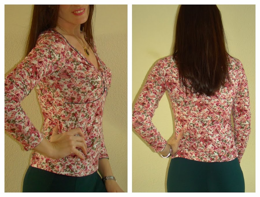 Esta camiseta la he hecho para el pantalón verde que tenía del año pasado, es de punto elástico con estampado tipo toile de jouy y ha sido la excusa perfecta para poder hacer el modelo que tenía en mente hace tiempo