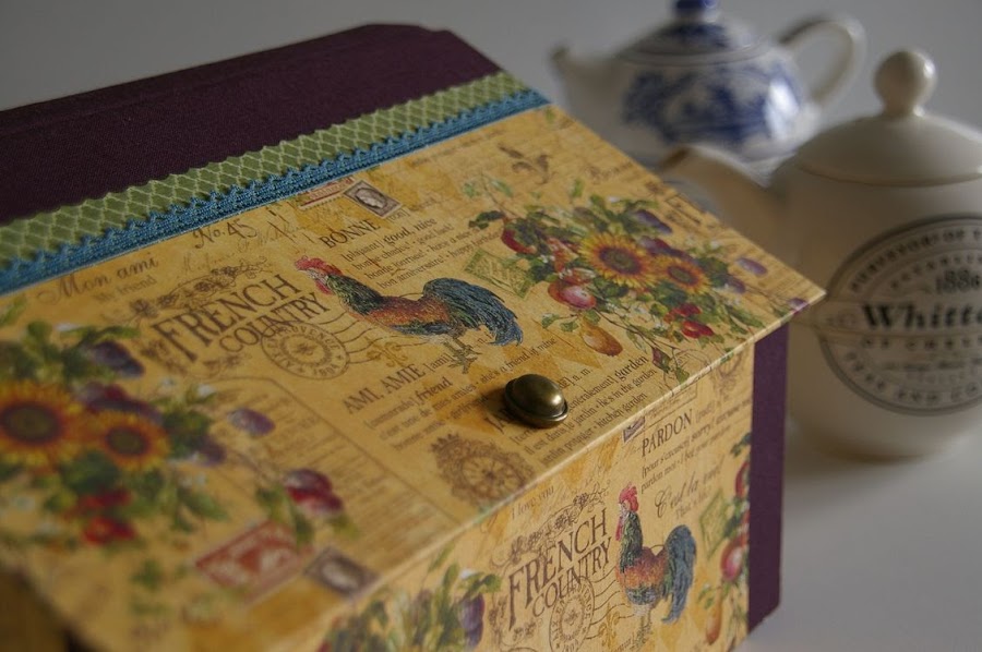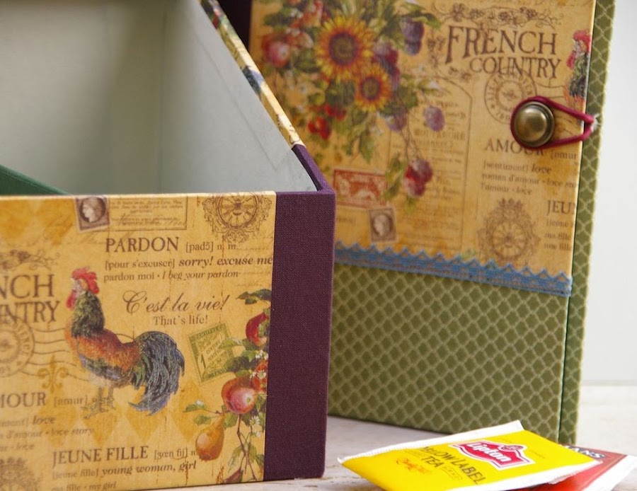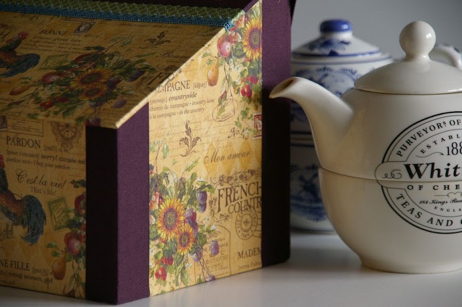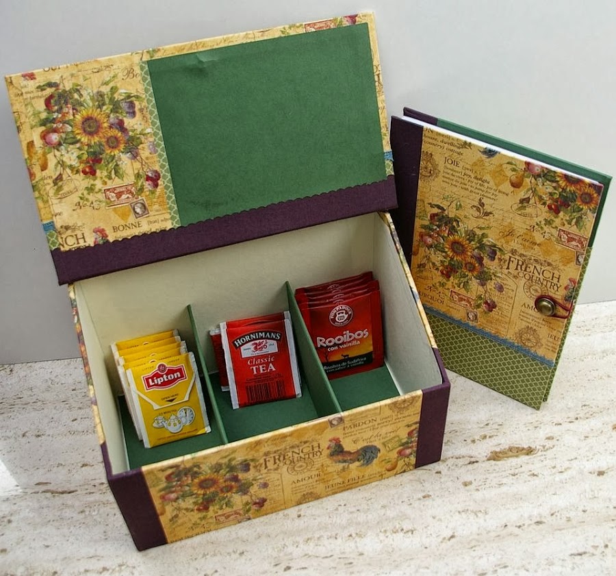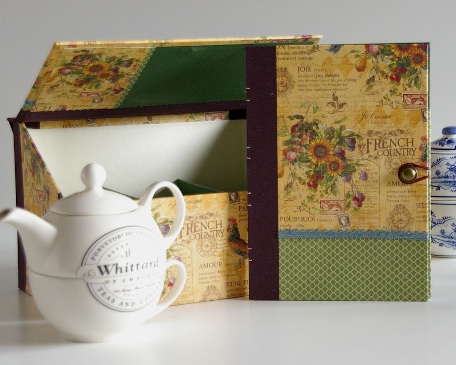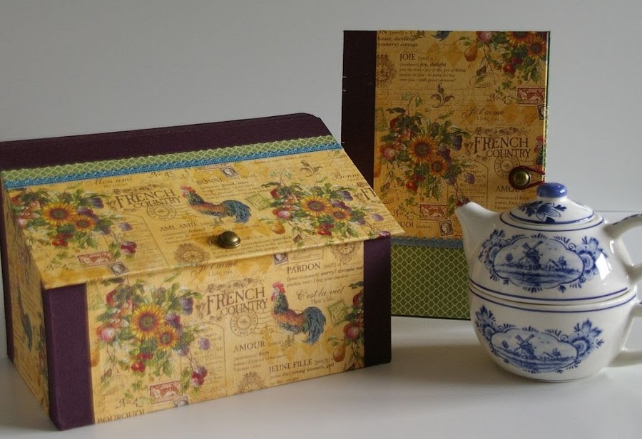 Una original caja de té y una libreta con las tapas en el mismo papel, para que Mª Nieves anote sus recetas.
