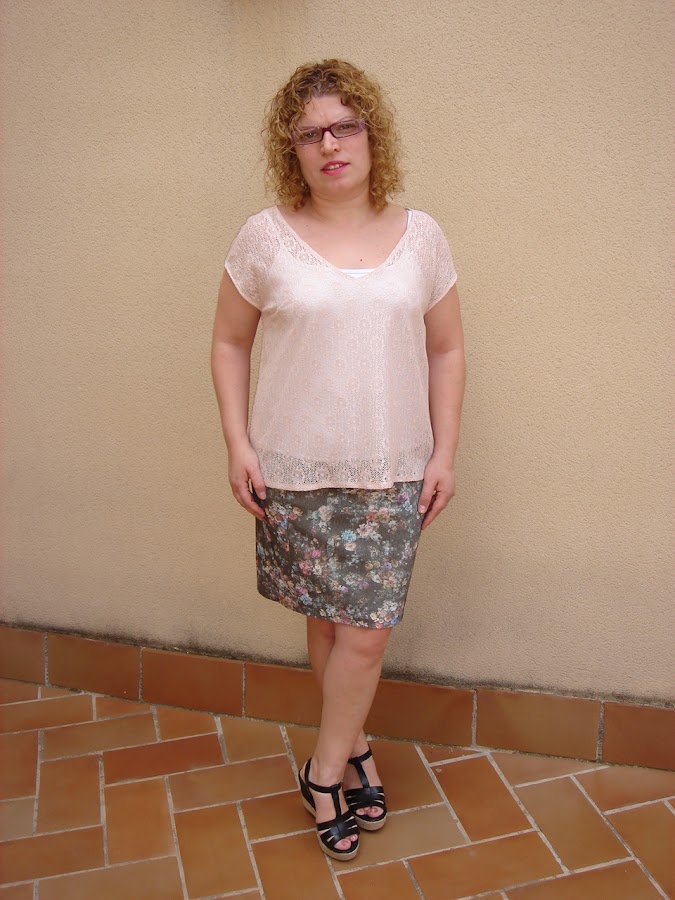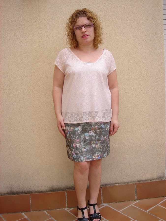 Un conjunto donde predominan los colores suaves , el rosa palo de la blusa y los tonos pastel de las florecitas de la falda.