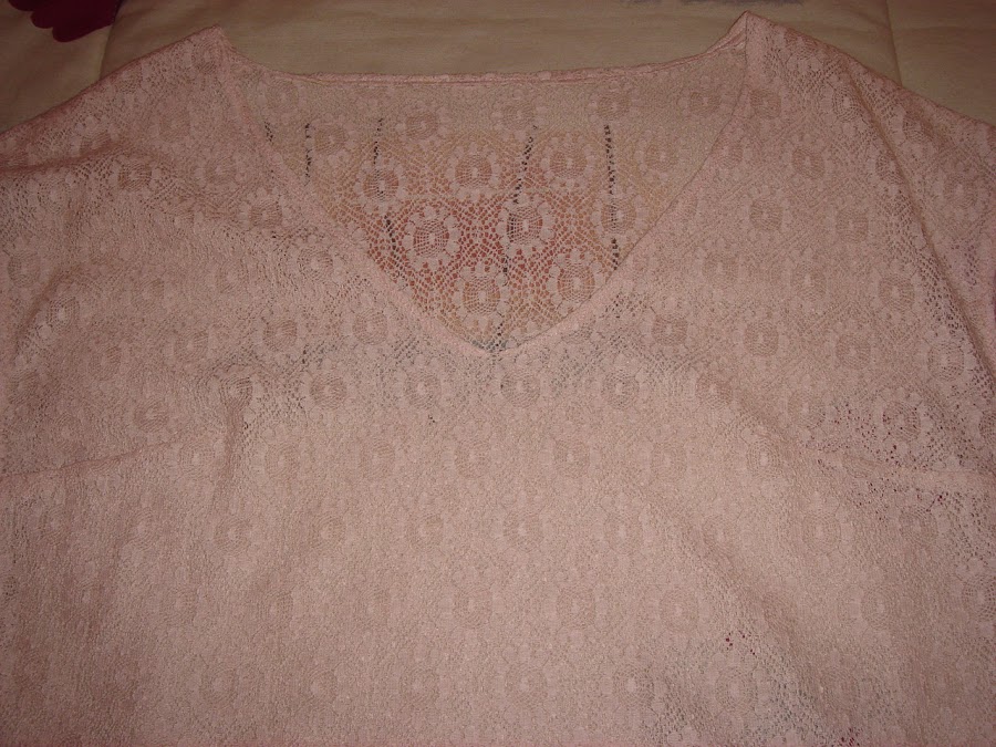 La tela de la blusita es un encaje de color rosa que hace el dibujo de unas florecitas , lleva pinzas en el pecho , escote de pico y la manga caida.