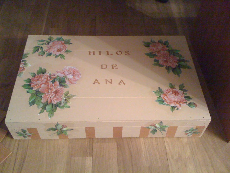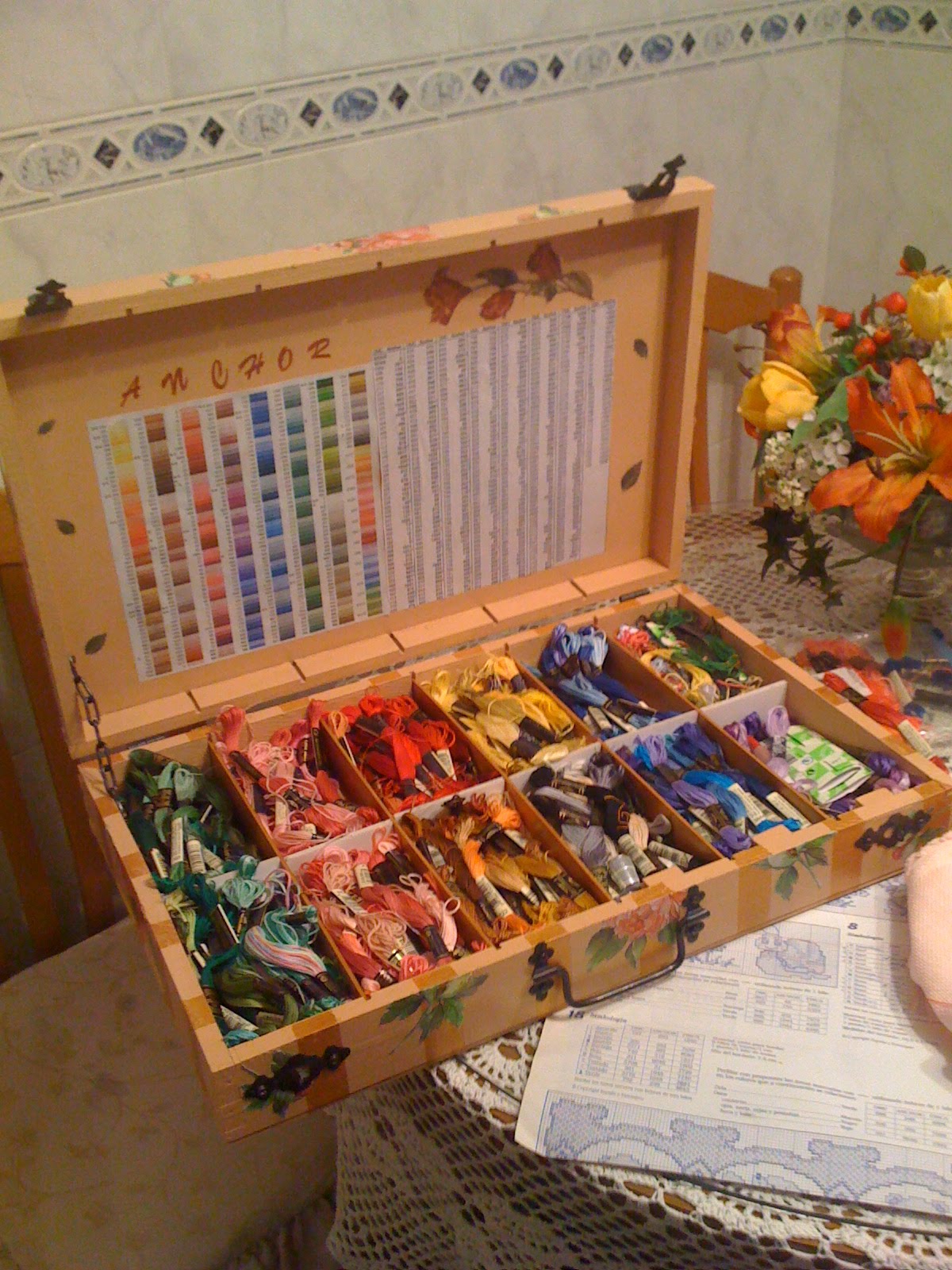 Eso le pasó a esta caja-maletín que inicialmente contenía 4 botellas de vino, acabó siendo un "maletín" para organizar los hilos de punto de cruz de mi madre, ya que, como se puede comprobar, tiene bastantes y así quedaron más organizados....