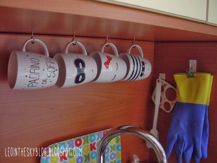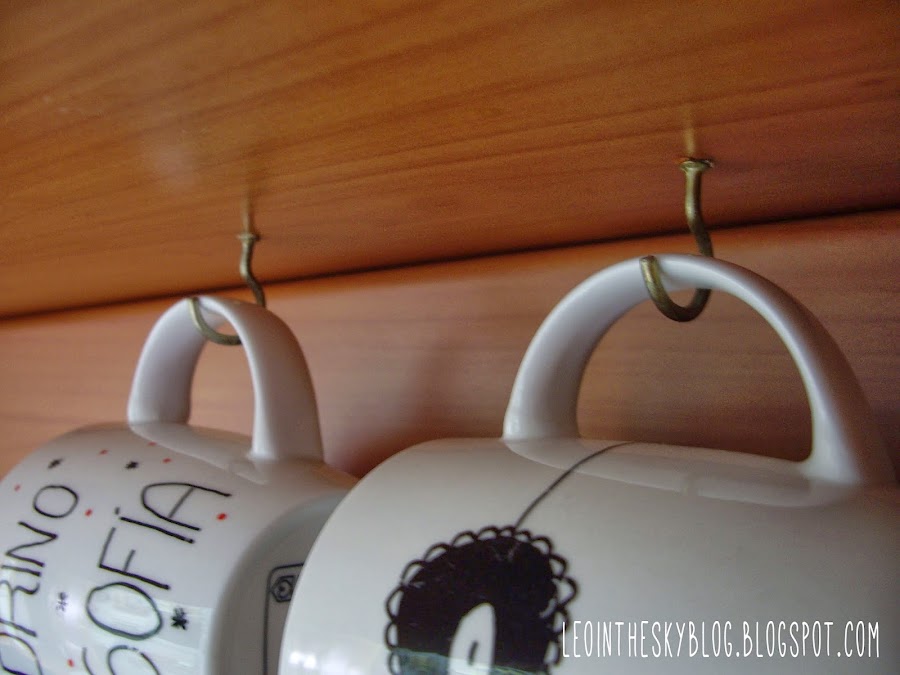 Resulta que mi "necesidad" de pintar tazas no se lleva bien con el espacio que tengo en casa para guardarlas, así que se me ocurrió esta solución para poder tener a mano algunas de las tazas que más utilizo. Se trata de atornillar un gancho directamente en la parte baja del mueble que está sobre el fregadero, así: