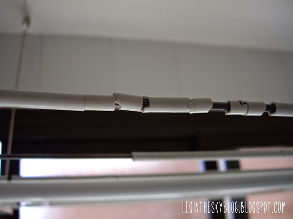 El proceso fue bastante simple, desatornillar cada varilla con la llave inglesa, tirar los restos del recubrimiento de plástico (¡¡qué gusto me dio esto!!), meter la varilla en el tubo, cortar el tubo y volver a meter la varilla en su sitio, así hasta seis varillas...y por fin...¡ya puedo tender a gusto! sin tener que barrer el suelo cada dos por tres y sobre todo y más importante sin peligro de que se manche la ropa :)