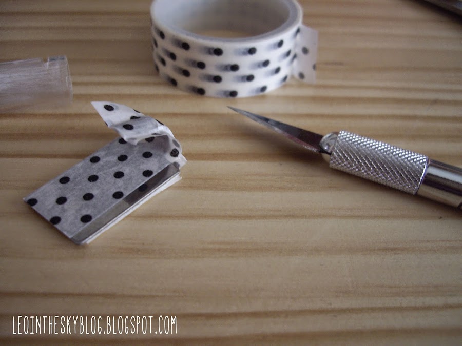 Los pasos son tan simples como forrar la percha con washi tape con mucho cuidado como se ve en la imagen y luego recortar con tijeras y cúter los sobrantes: