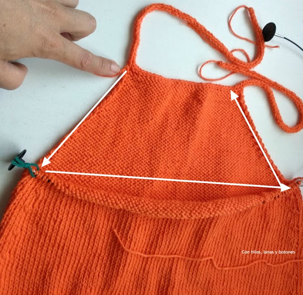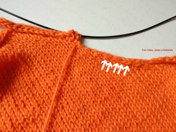 Si os fijáis bien, por el derecho del top, en los laterales del canesú, se ven una especie de "V" o flechitas que se formaron al hacer las disminuciones del delantero. Yo fui cogiendo los puntos justo ahí en lugar de cogerlos en el borde. Podéis hacerlo como os sea más fácil, aunque tras probar de las dos formas creo que queda mucho mejor cogiéndolos de esta forma.