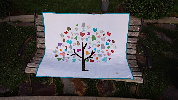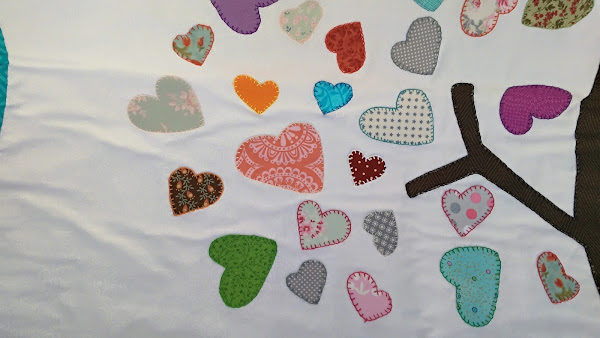 Es un top de un metro por un metro, todas las piezas las he aplicado con friselina doble cara y llevan festón en el contorno cosido a mano. El montaje es con guata termoadhesiva y el acabado es un biés. Este biés lo hice con de dos tiras de 5 cm unidas y planchadas por la mitad, la primera vuela la cosí a máquina y la segunda esta cosido a mano.