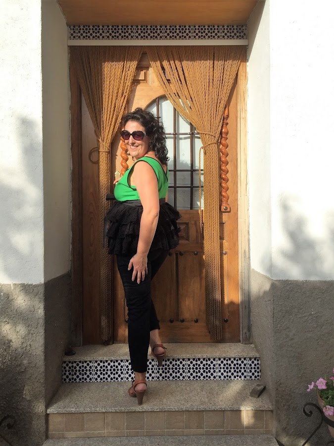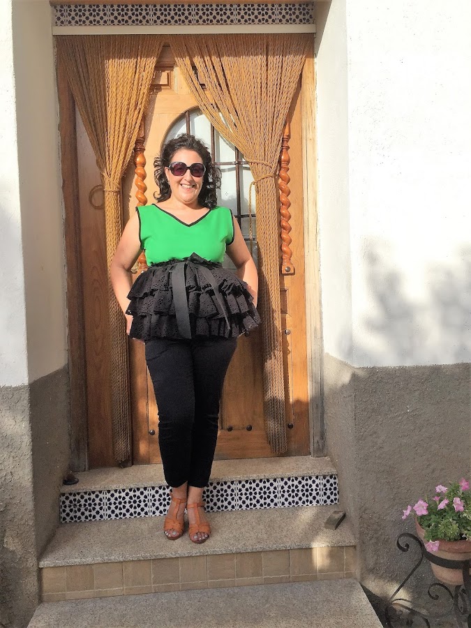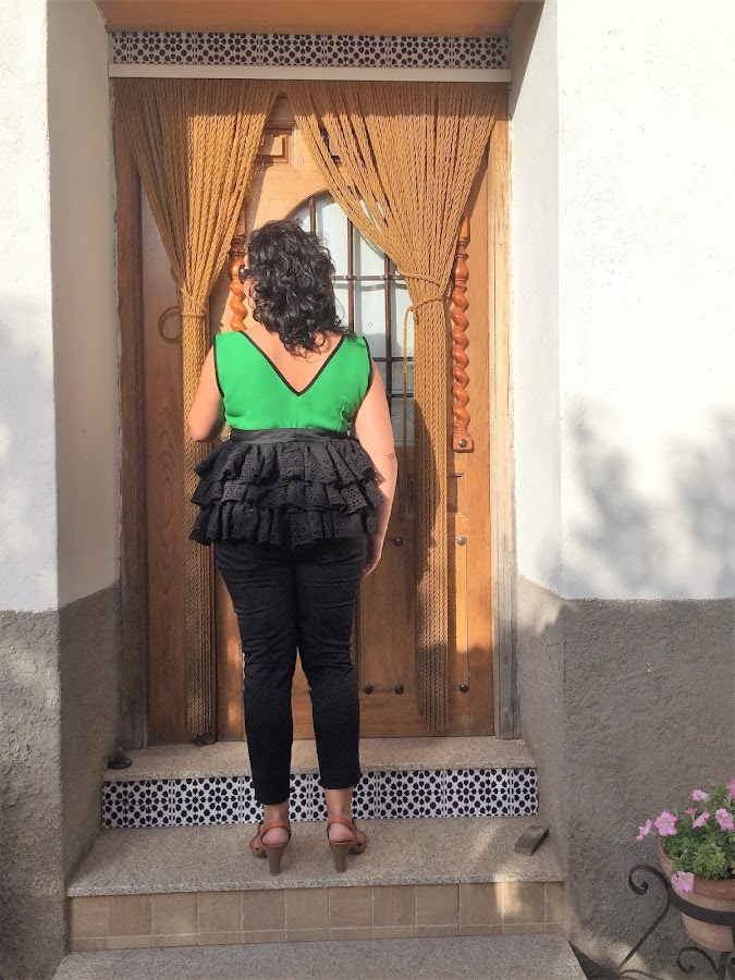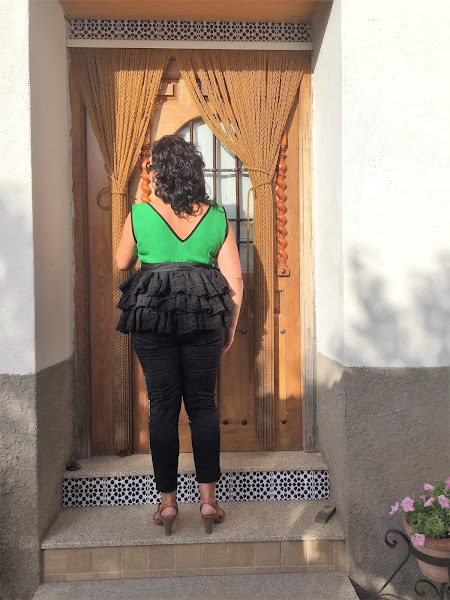 Pues aquí tenéis el top, que decidí combinar con un pantalón negro capri y unas sandalias en color camel. El top me encanta, aunque tal vez me he pasado de volumen en los volantes, tal vez es demasiado voluminoso, pero la verdad es que me gusta como queda.