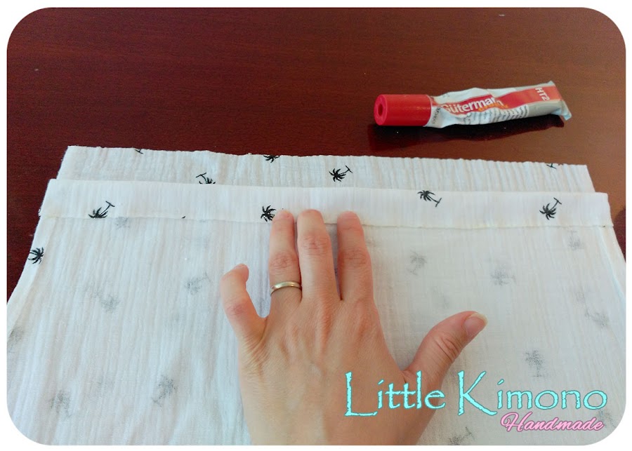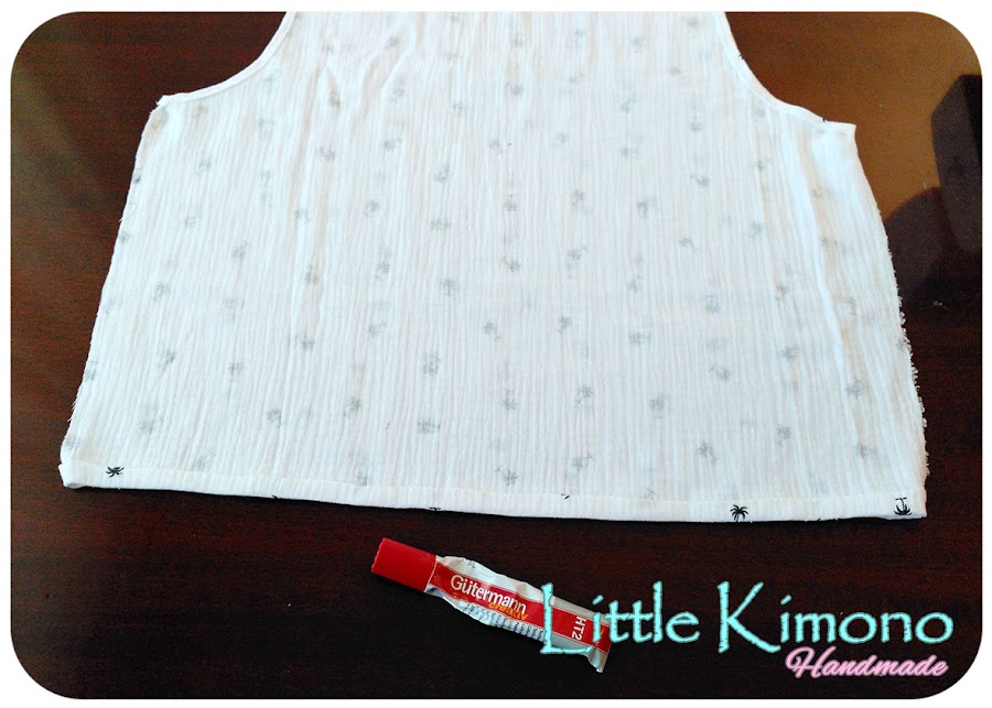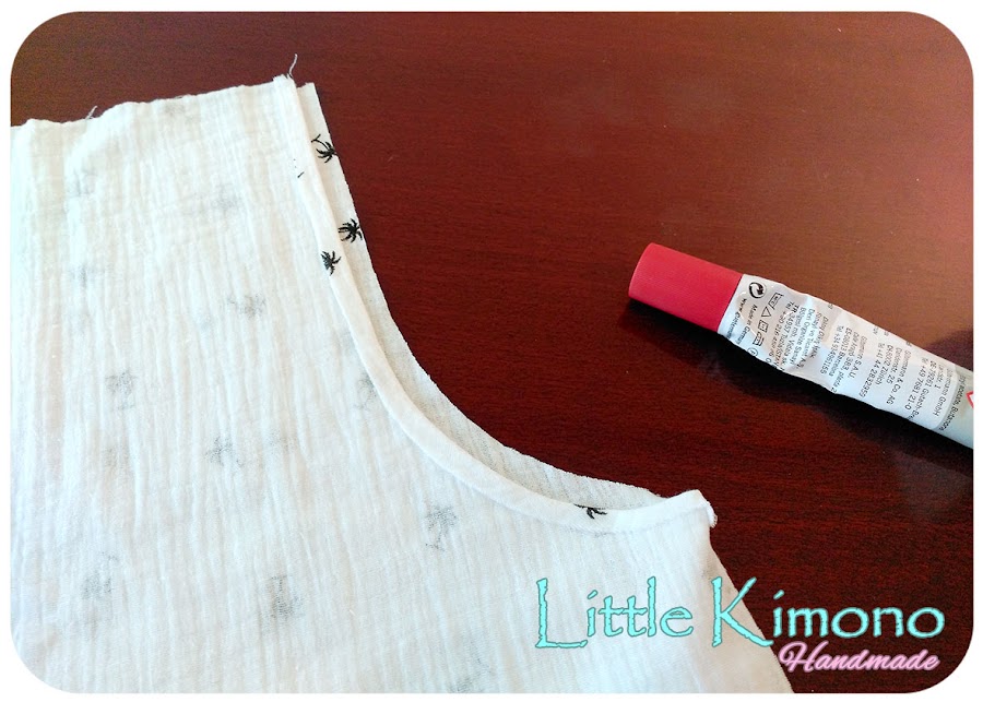 6. Ahora para la parte del cuello, en la pieza frontal doblaremos unos 2cm y aplicamos el pegamento en linea justo en el borde para que nos quede una especie de canal para pasar el trapillo que nos servirá para atarlo.