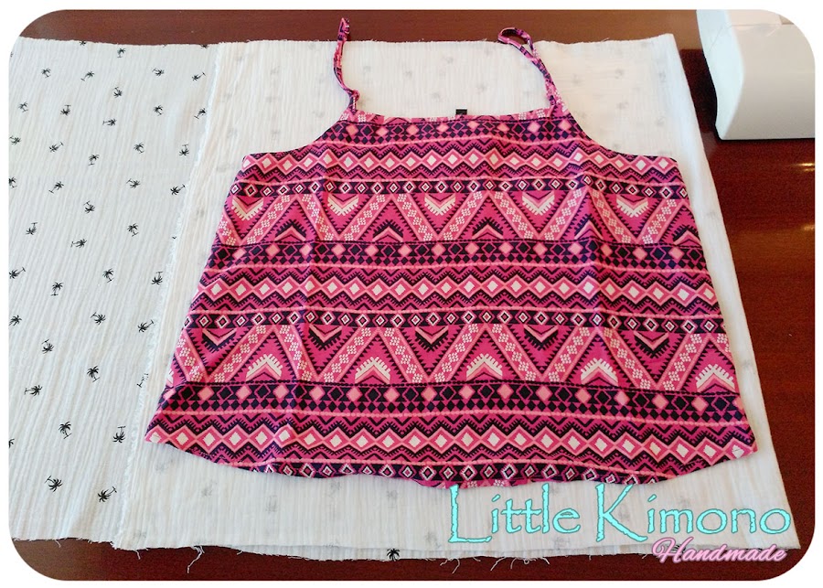 1. Doblamos la tela por la mitad, en vertical, la parte estampada la dejaremos "mirando hacia dentro" así tendremos la parte trasera y la parte delantera del top.