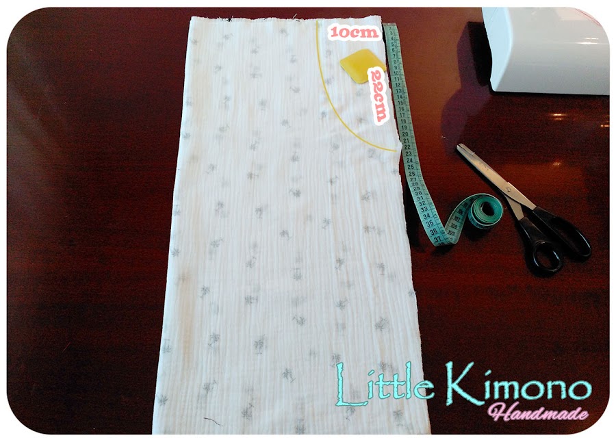 4. Ahora cortaremos la parte de la manga, para calcular el largo podéis hacerlo midiendo desde el cuello (en linea recta) a la altura donde queréis que vaya la sisa más o menos, en mi caso eran 22cm, así que desde la parte de arriba hacia abajo medí 22cm y desde la esquina hacia dentro unos 10cm, marcáis con tiza de sastre y unís los dos puntos con una curva como la de la imagen.