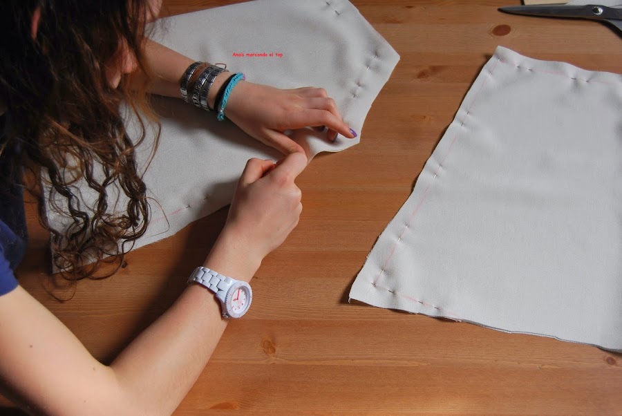 Cortamos las vistas. Y las unimos al top, dejando los cordones de los tirantes entre las vistas y el top.