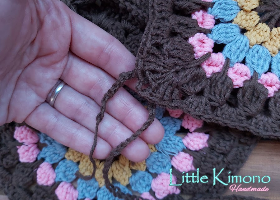 Y con tiras de cadenetas de unos 150 puntos vamos hacer el cierre, ataremos una tira a cada lado, en la esquina de cada granny, pasandolo por las 2 puntadas centrales de éste y cerrando por la parte interior con puntos deslizados.