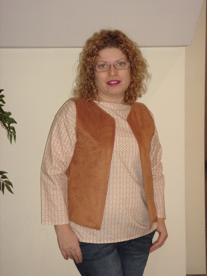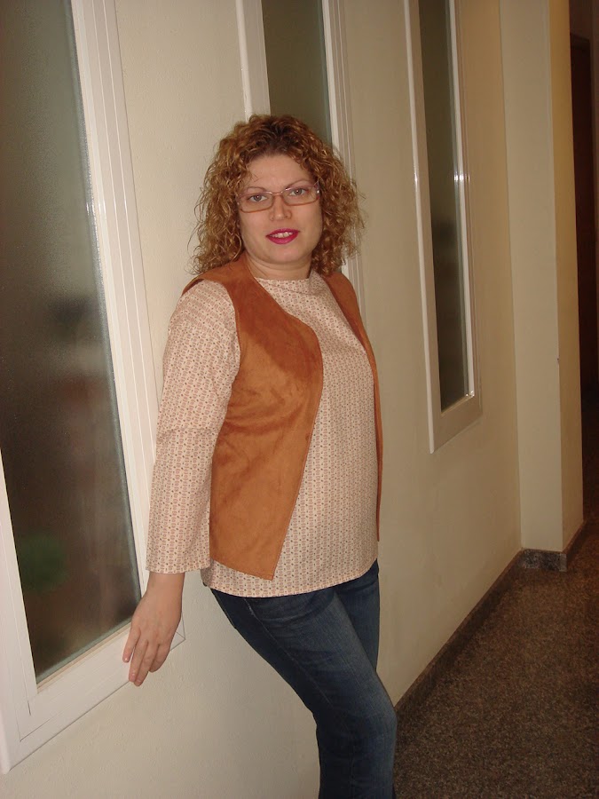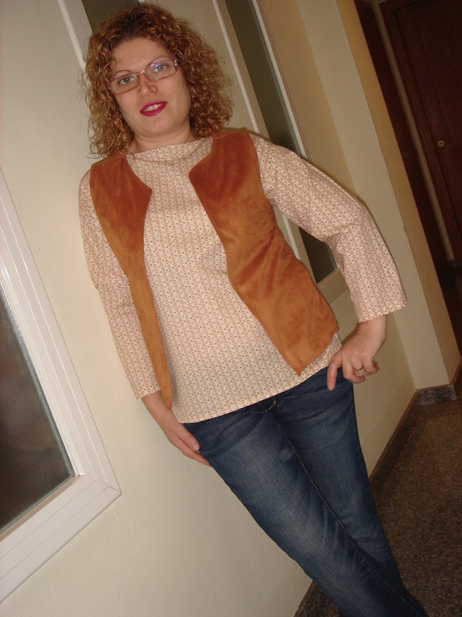 Si os fijais erl color del estampado de la tela del top le viene que ni pintado al color marron del chaleco de la antelina del chaleco.