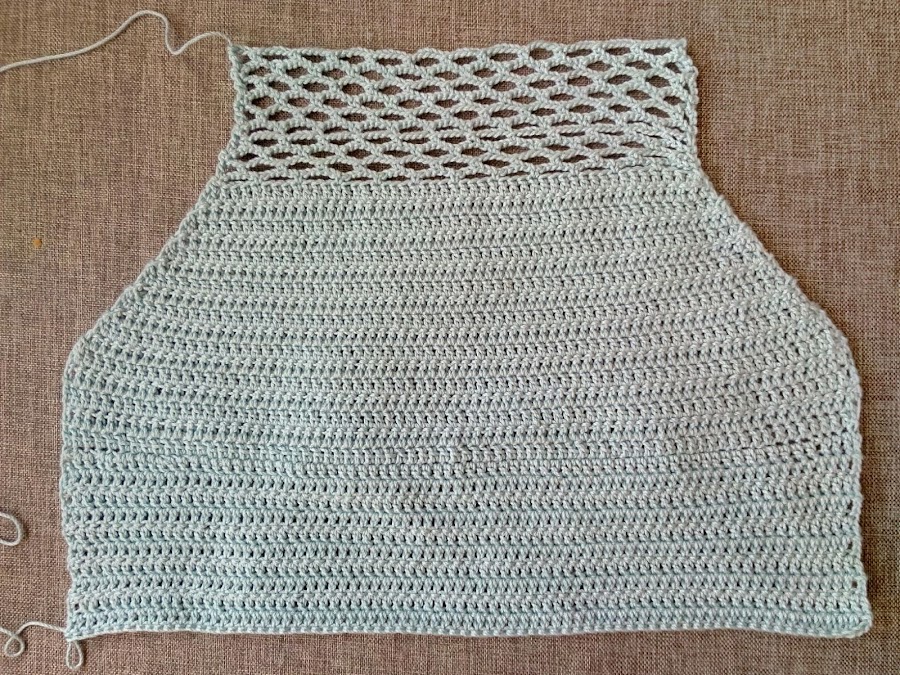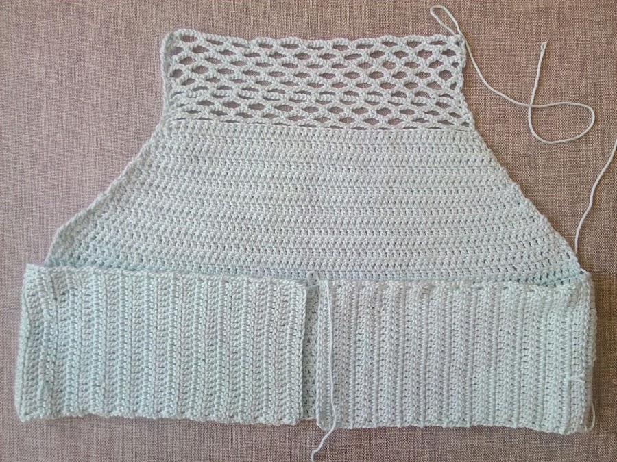 5. Enganchamos hilo en la esquina de la primera fila de abajo y tejemos puntos altos hasta la fila 13 incluida (justo hasta la última fila sin aumentos ) A mí me salen 24 puntos pero esto depende,ya que hay que ir sacando los puntos. Si hasta ahora hemos tejido en horizontal esto es igual de fácil pero en vertical. 24 vueltas o filas de un lado.Después,me voy a la otra esquina y hago lo mismo.Engancho hilo y tejo otras 24 vueltas.Yo lo he hecho así porque quería ponerme el top con sujetador y que no se viese por detrás. Así,que luego he unido los extremos con punto deslizado por la parte del revés y así queda: