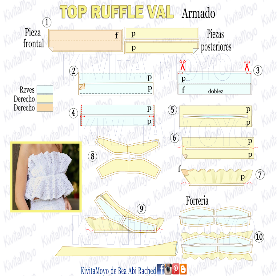 Para terminar sujetar con puntadas invisibles el volado superior al bustier para que este no se pliegue hacia abajo. Prenda terminada.