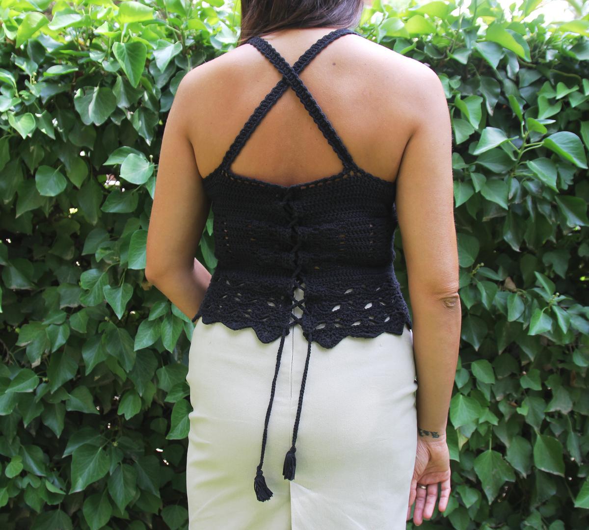 Los tirantes están cruzados y unidos con punto corredizo a la espalda.