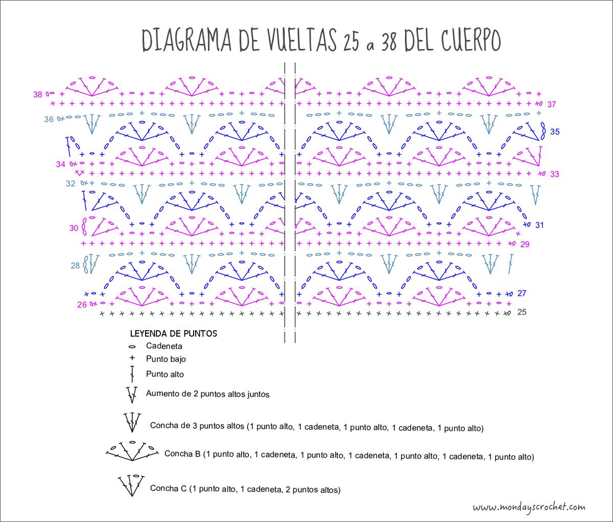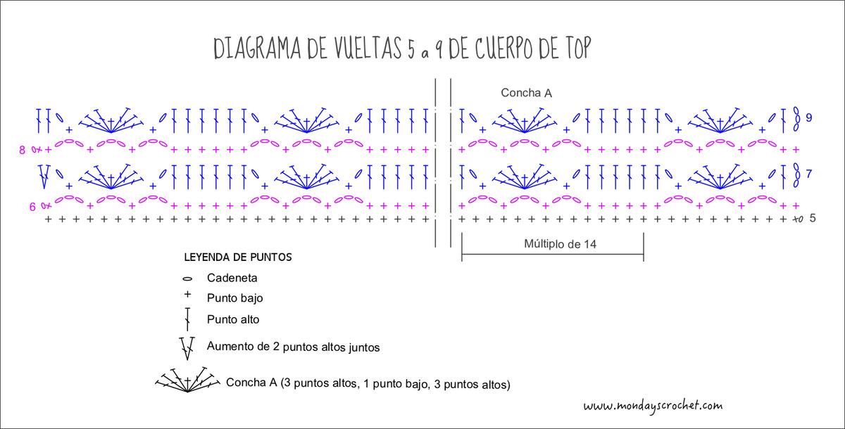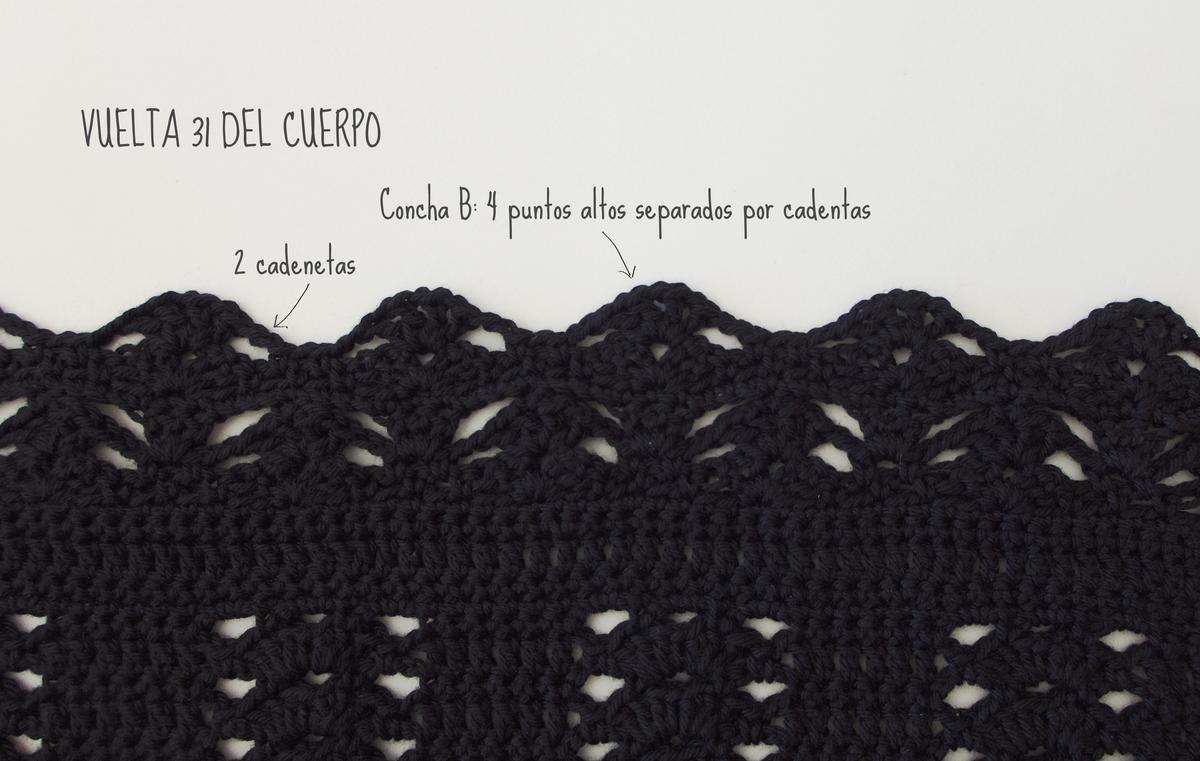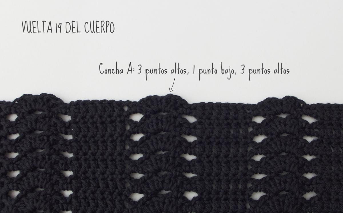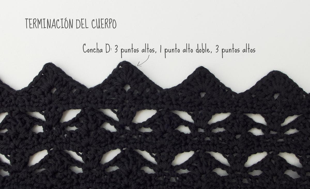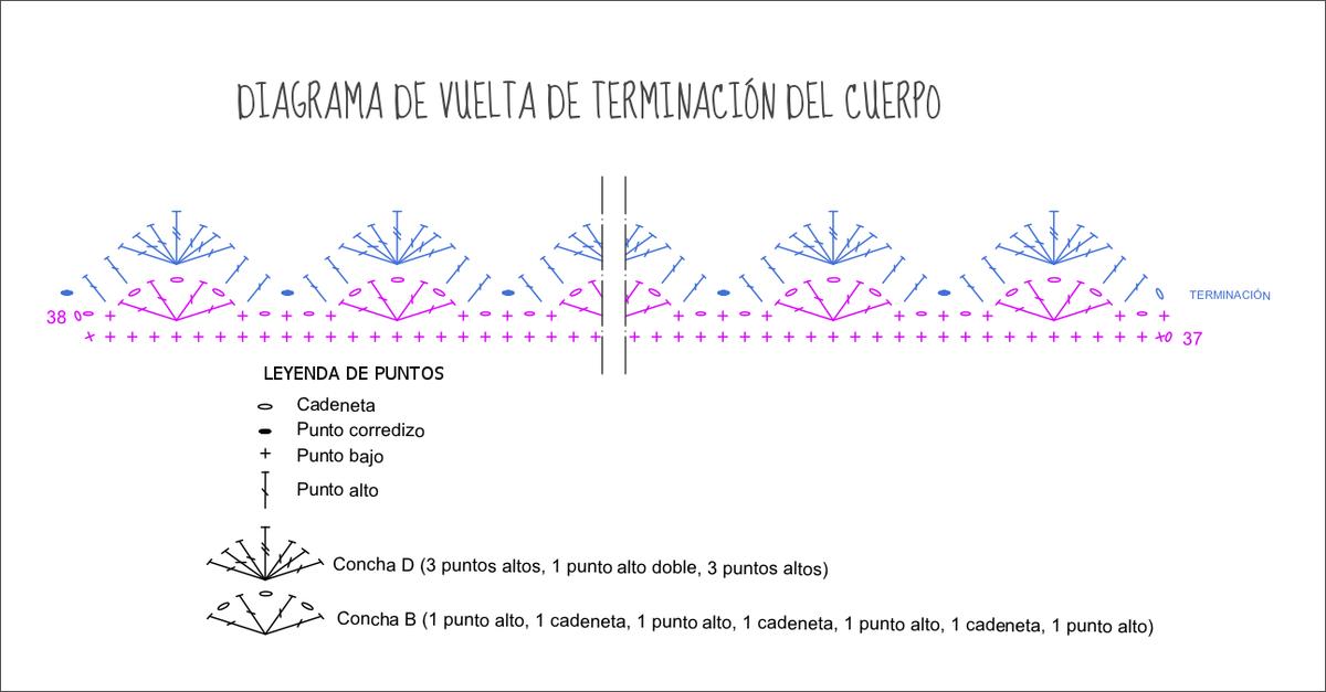 La última vuelta es la terminación del cuerpo del top. Hemos diseñado unas conchas que forman bonitos picos. VUELTA DE TERMINACIÓN DERECHO: Tejemos 1 c.a.d. de subida, saltamos 1 punto, 1 p.a. en el p.b. más próximo a la concha de la vuelta anterior, 1 p.a. en la primera c.a.d. de la concha de la vuelta anterior, 1 concha D en el centro de la concha de la vuelta anterior, 1 p.a. en la última c.a.d., 1 p.a. en el primer p.b., saltamos 1 punto y 1 p.c. en el p.b. central. Repetimos *saltamos 1 punto, 1 p.a. en el p.b. más próximo a la concha de la vuelta anterior, 1 p.a. en la primera c.a.d. de la concha de la vuelta anterior, 1 concha D en el centro de la concha de la vuelta anterior, 1 p.a. en la última c.a.d., 1 p.a. en el primer p.b., saltamos 1 punto y 1 p.c. en el p.b. central* 16 veces más.