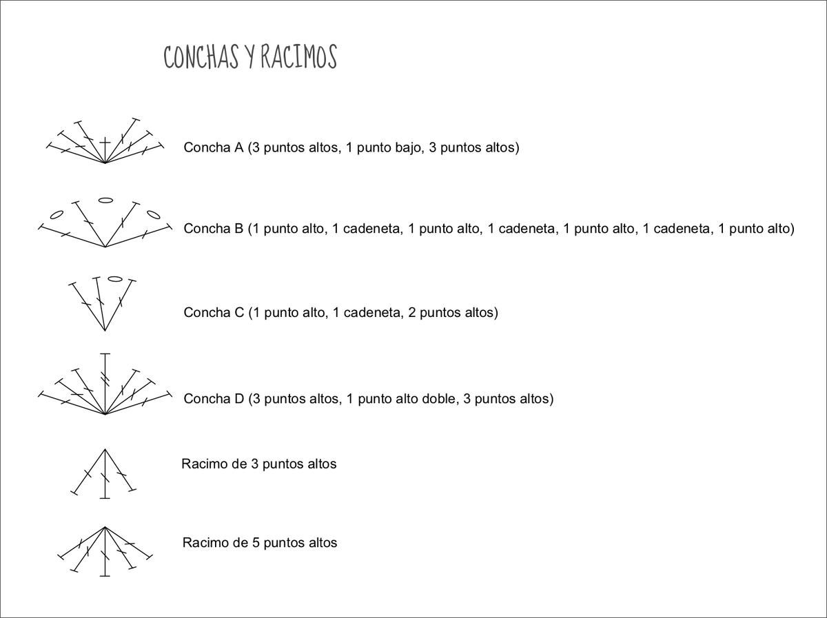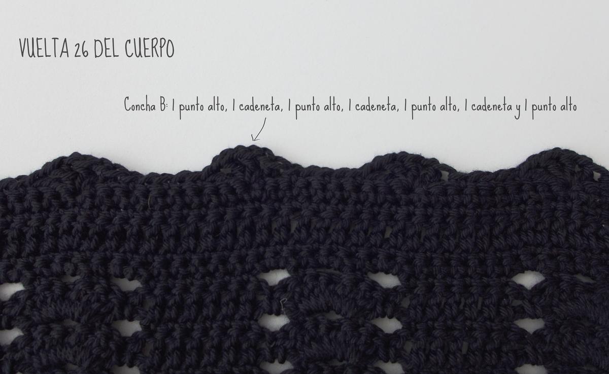 VUELTA 26 REVÉS: Tejemos 1 c.a.d. de subida y 1 p.b. en el primer punto, 1 c.a.d., 1 p.b., saltamos 2 puntos, 1 concha B, saltamos 2 puntos, 1 p.b., 1 c.a.d., saltamos 1 punto, 1 p.b., 1 c.a.d., saltamos 1 punto, 1 p.b. Repetimos *saltamos 2 puntos, 1 concha B, saltamos 2 puntos, 1 p.b., 1 c.a.d., saltamos 1 punto, 1 p.b., 1 c.a.d., saltamos 1 punto, 1 p.b.* 15 veces más.