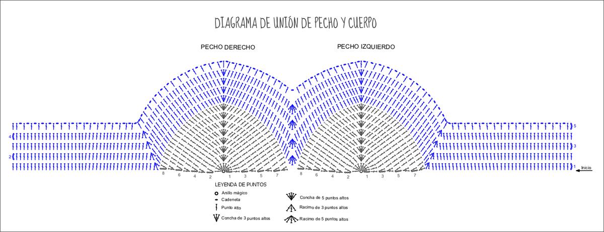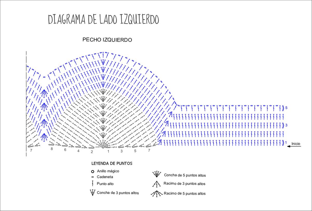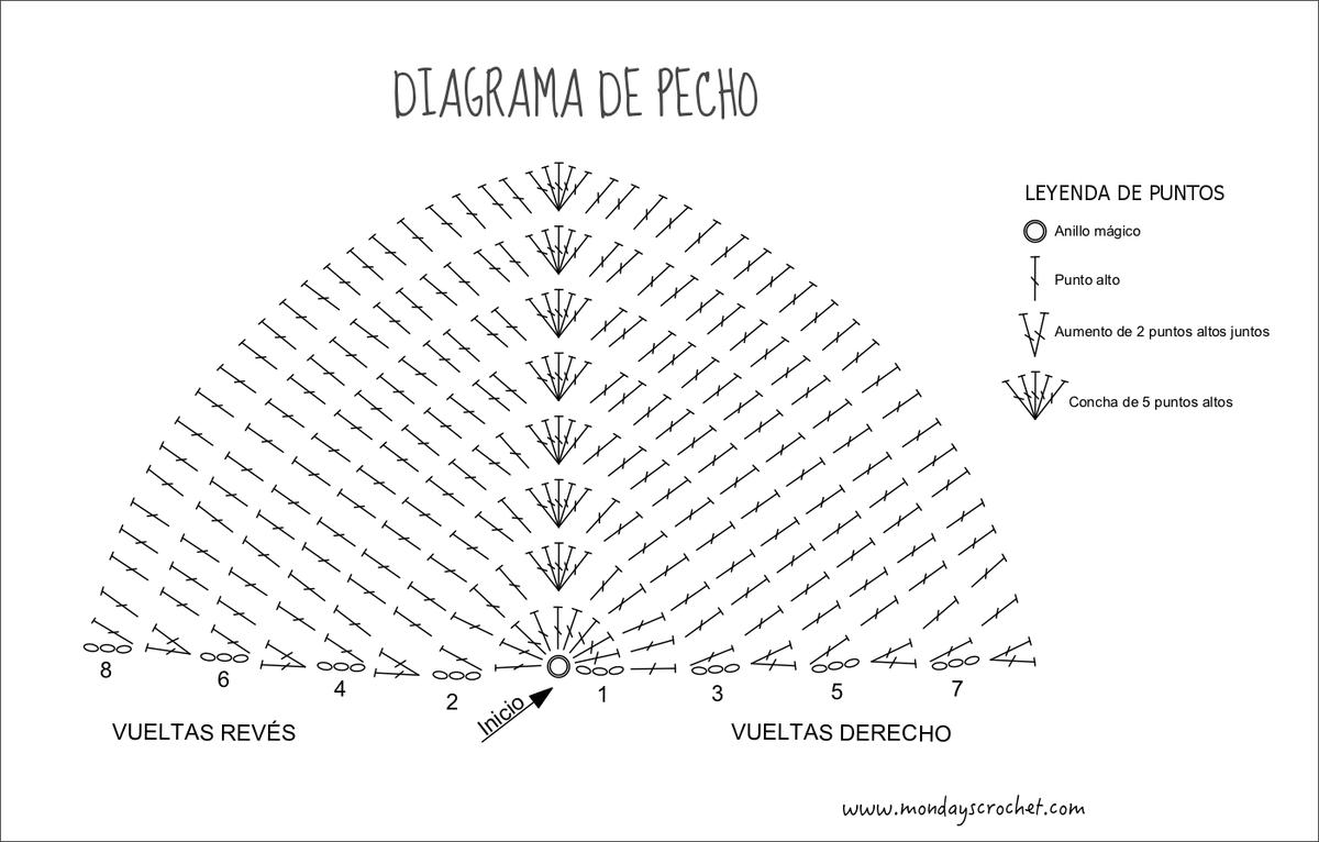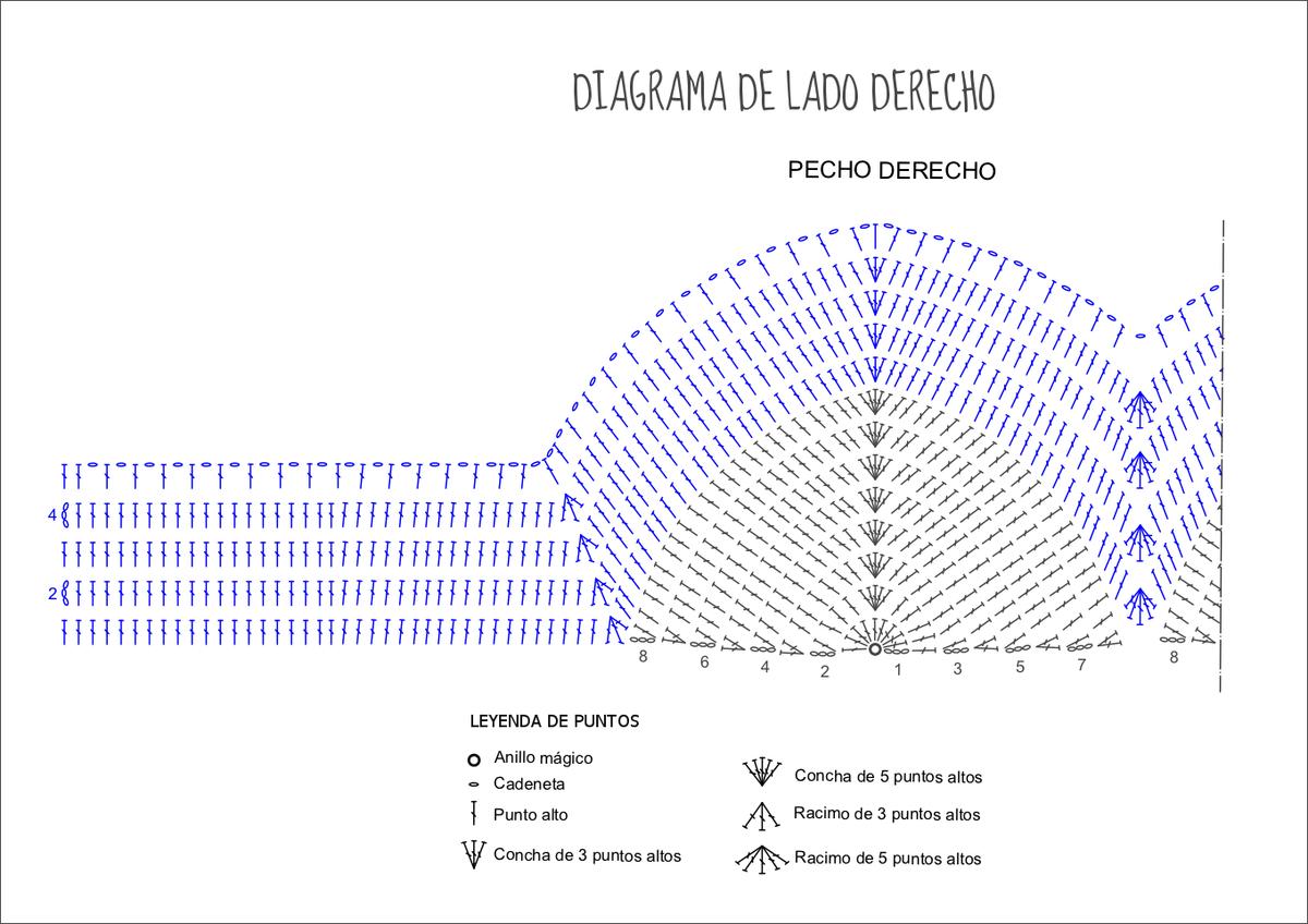 VUELTA 1 DERECHO: Tejemos 3 c.a.d. de subida, 38 p.a., 1 rac. de 3 p.a., 24 p.a., 1 concha de 3 p.a., 23 p.a., 1 rac. de 5 p.a. en el centro del pecho, 23 p.a., 1 concha de 3 p.a., 24 p.a., 1 rac. de 3 p.a., 39 p.a. VUELTA 2 REVÉS: Tejemos 3 c.a.d. de subida, 37 p.a., 1 rac. de 3 p.a., 24 p.a., 1 concha de 3 p.a., 22 p.a., 1 rac. de 5 p.a. en el centro del pecho, 22 p.a., 1 concha de 3 p.a., 24 p.a., 1 rac. de 3 p.a., 38 p.a. VUELTA 3 DERECHO: Tejemos 3 c.a.d. de subida, 36 p.a., 1 rac. de 3 p.a., 24 p.a., 1 concha de 3 p.a., 21 p.a., 1 rac. de 5 p.a. en el centro del pecho, 21 p.a., 1 concha de 3 p.a., 24 p.a., 1 rac. de 3 p.a., 37 p.a.