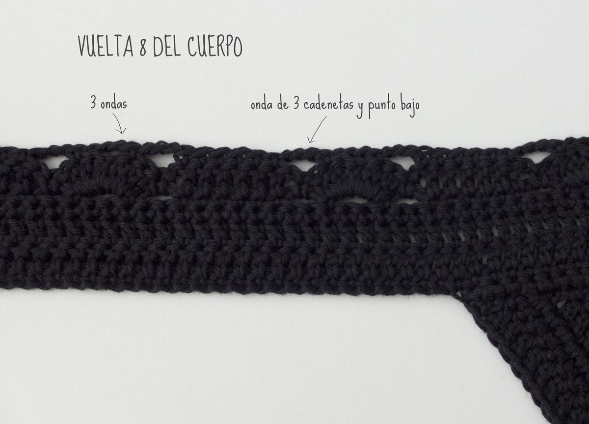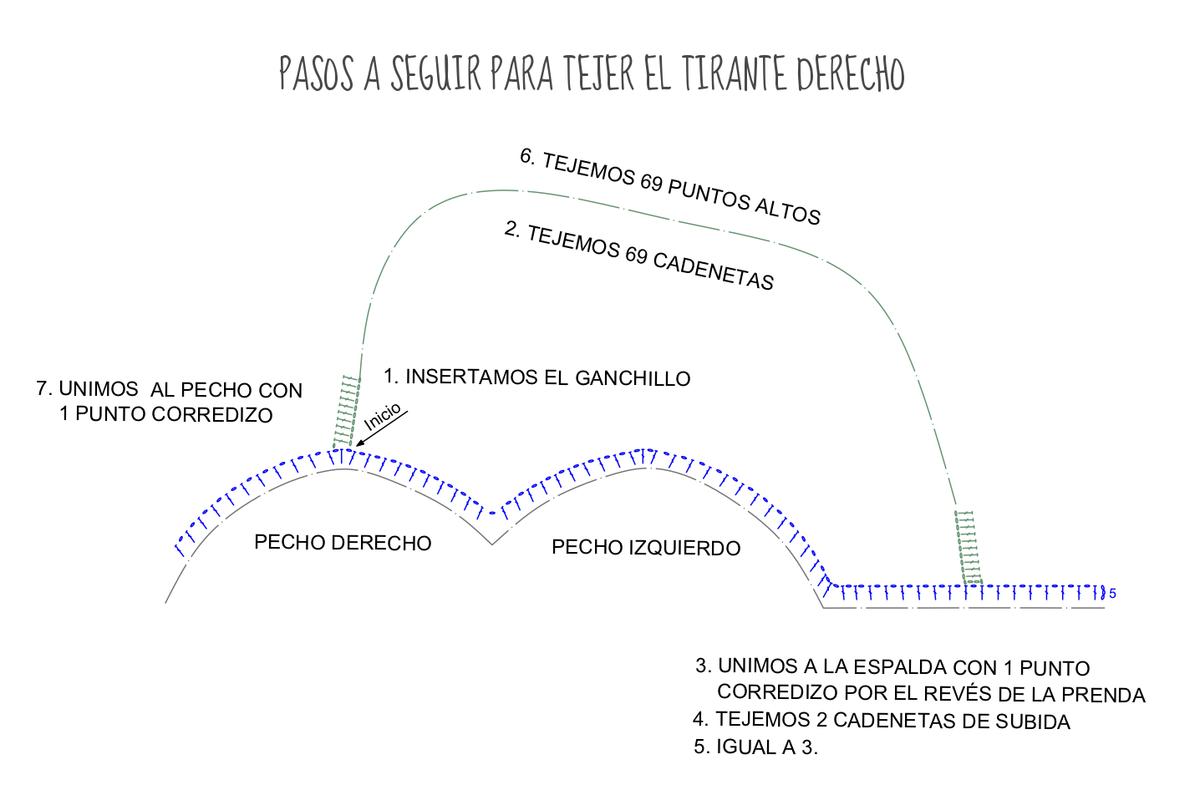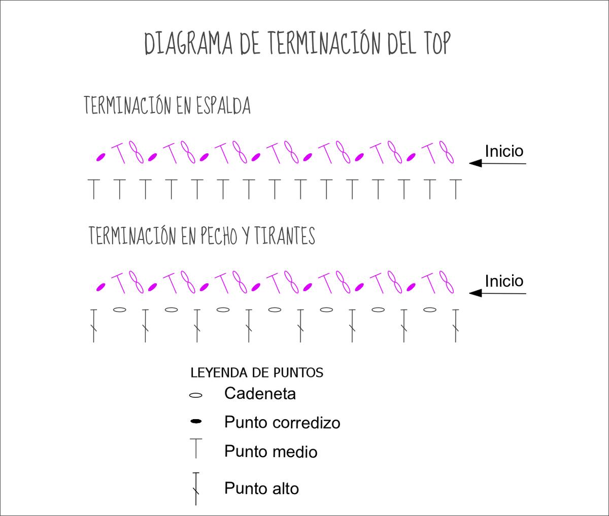 VUELTA DE TERMINACIÓN: 2 c.a.d. de subida, 1 p.m. y 1 p.c. Repetimos * 2 c.a.d. de subida, 1 p.m. y 1 p.c. * en todos los puntos de los laterales de la espalda, tirantes y pecho.