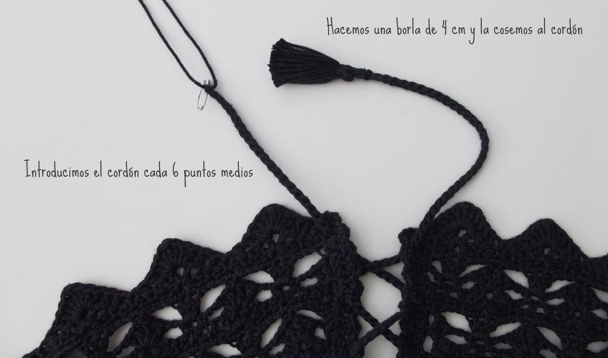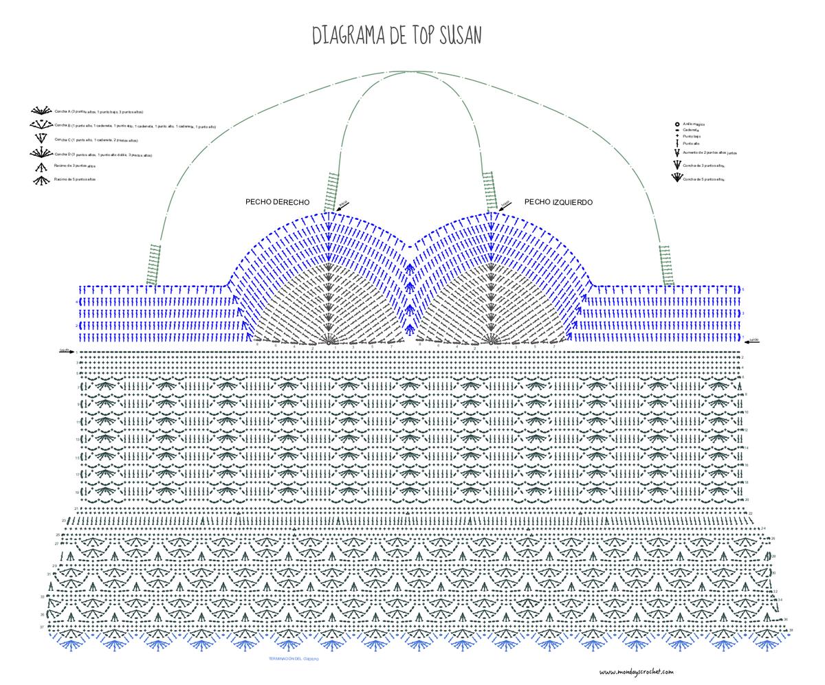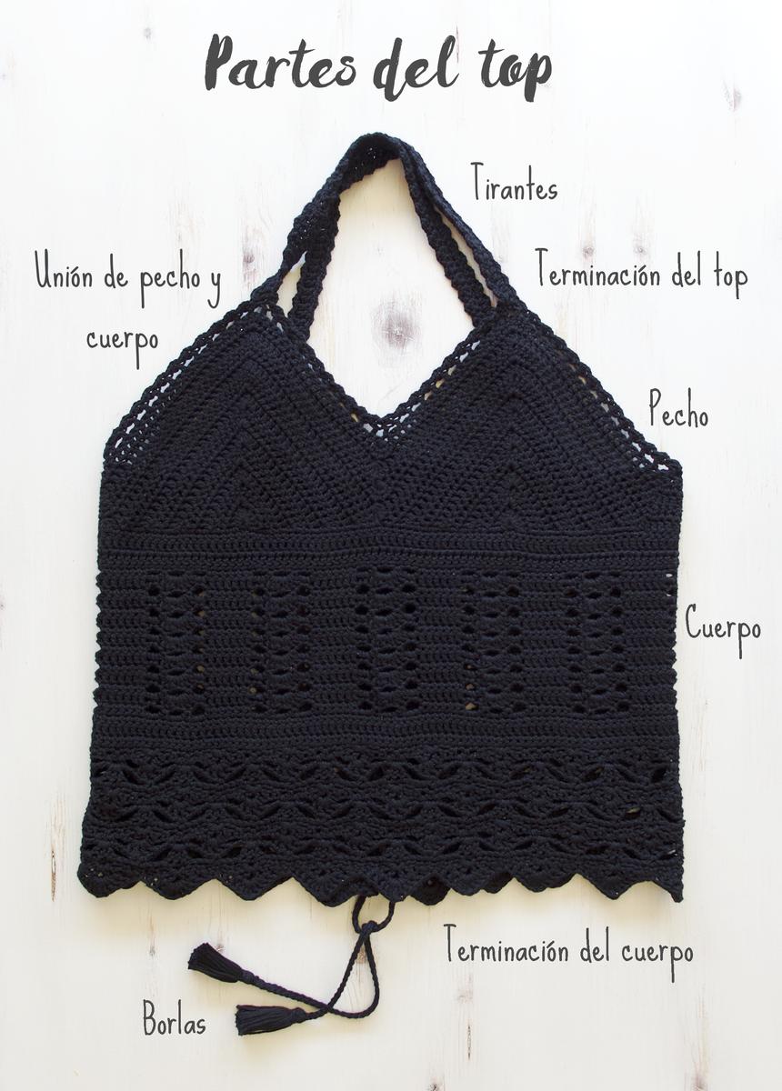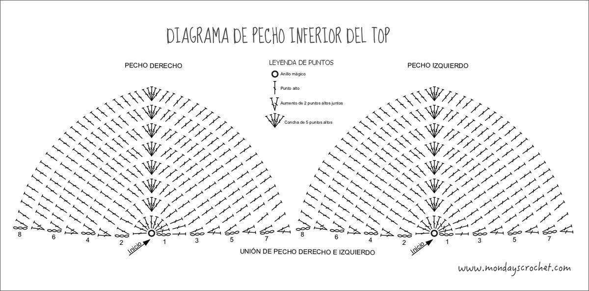 VUELTA DE TERMINACIÓN: 2 c.a.d. de subida, 1 p.m. y 1 p.c. Repetimos * 2 c.a.d. de subida, 1 p.m. y 1 p.c. * en todos los puntos de los laterales de la espalda, tirantes y pecho.