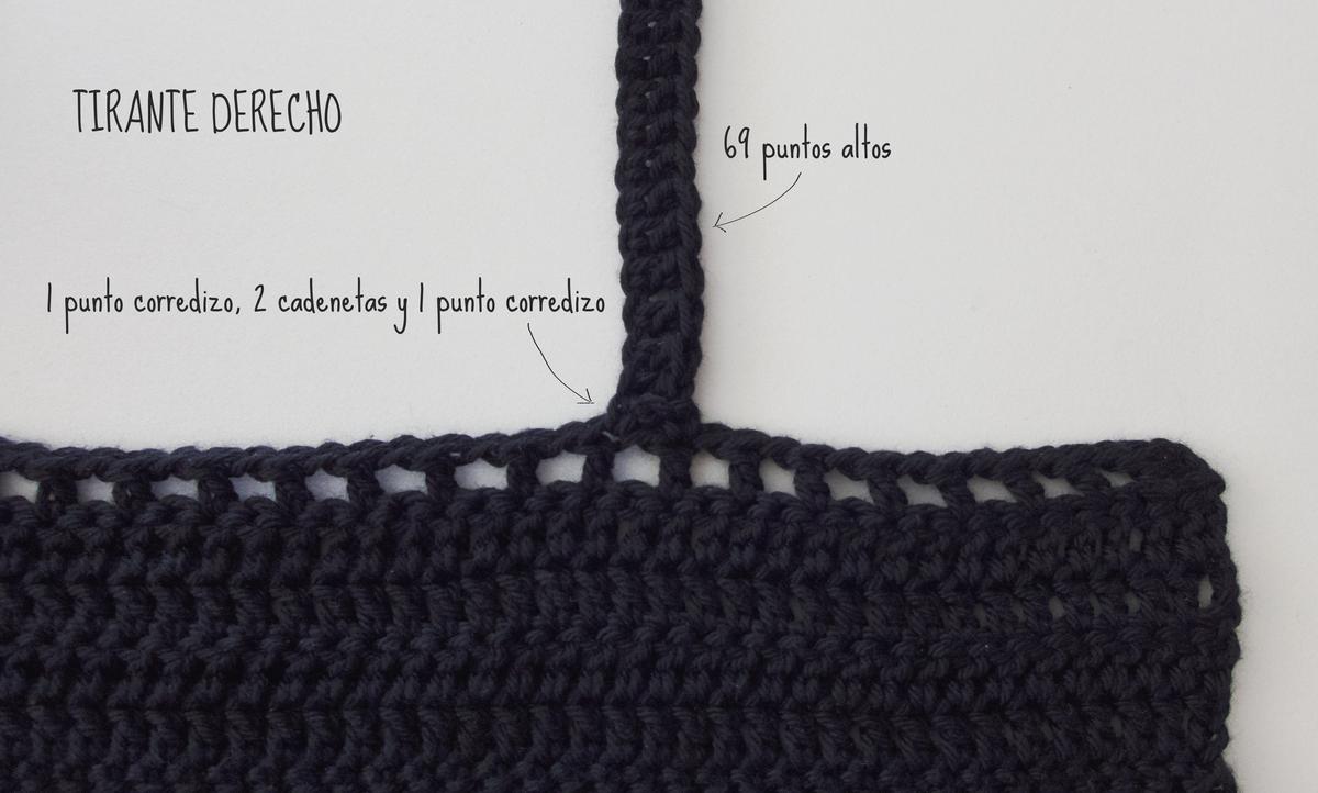 VUELTA 1 DERECHO: Tejemos 2 c.a.d. de subida y 1 p.c. por el revés de la prenda en el noveno p.a. contando desde la abertura de la espalda del top. Continuamos con 69 p.a. en la c.a.d. inicial y unimos el tirante con 1 p.c. por el derecho en la parte superior del pecho.