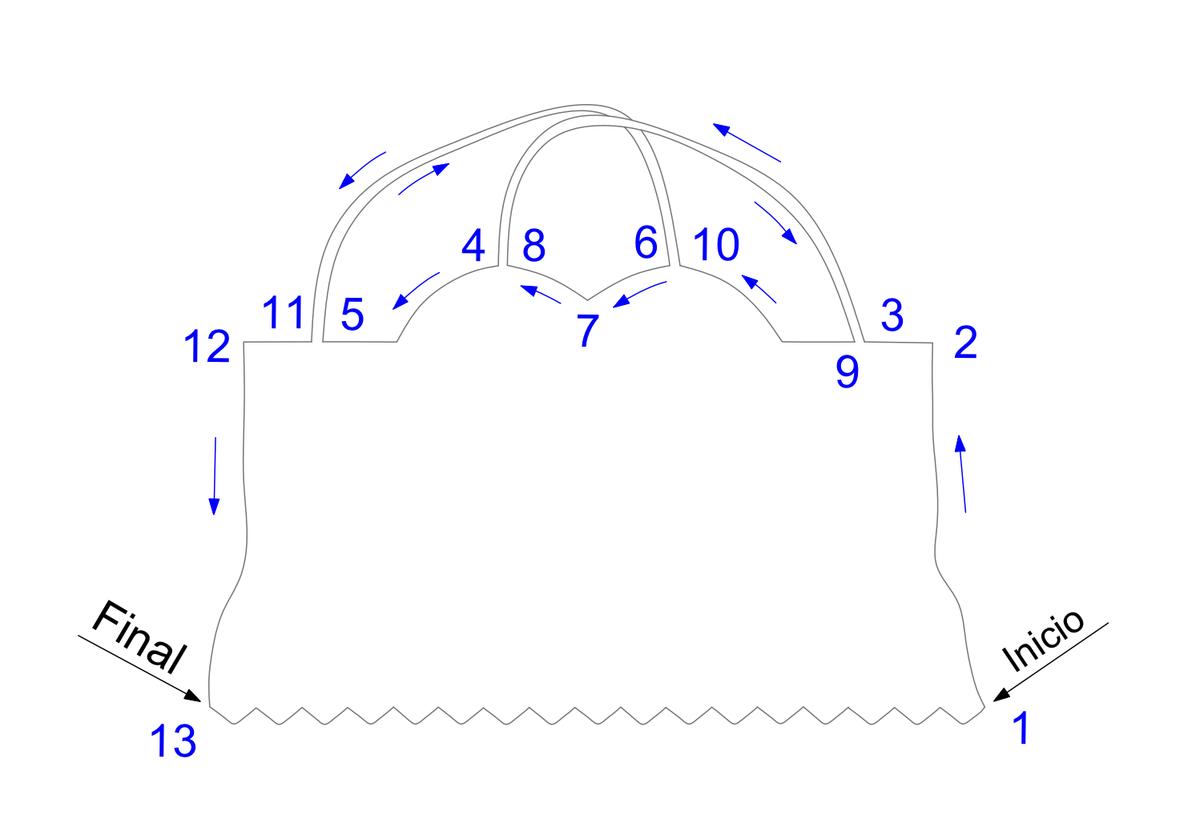 VUELTA 4 REVÉS: Tejemos 3 c.a.d. de subida, 35 p.a., 1 rac. de 3 p.a., 24 p.a., 1 concha de 3 p.a., 20 p.a., 1 rac. de 5 p.a. en el centro del pecho, 20 p.a., 1 concha de 3 p.a., 24 p.a., 1 rac. de 3 p.a., 36 p.a.