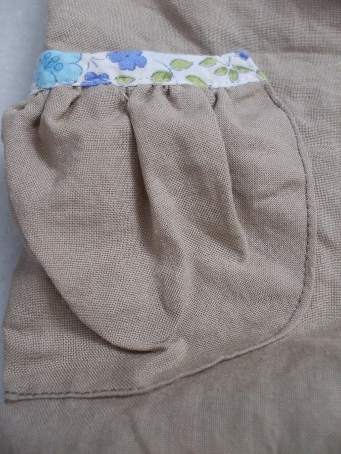 The top has a curious construction order, where you hem the front piece before sewing the side seams. It not as simple as it may look, and I wouldn´t recommend it to a newbie because there are a few laborious steps that might discourage anyone attempting this as their first pattern. The shorts and I are old friends, despite the fact that assembling the pockets takes me as long as making the rest of the shorts. To make them you have to gather, fold in and press a curve edge, cut, make and apply a bias binding and stitch a curved seam accurately. If I ever get a proper and even topstitch out of my machine, the result will be neater than this, but for the moment I think it´s OK.