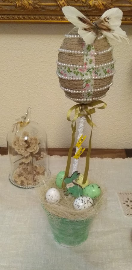 Lo primero que hice fue coger un huevo de porex , decorarlo con hilo de yute, perlitas, corte unas tiras de tela con motivos florales y lo corone con una hermosa mariposa, que simboliza la primavera.