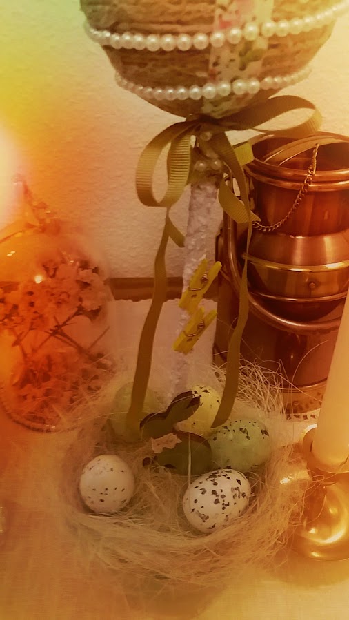 Como "aquí no se tira nada", me encontré por el sótano, una maceta con un palo de madera clavado, y me entró esa sonrisilla pillina, de cuando sabes que has encontrado justo lo que querías. Pues efectivamente , de ahí surgió este Topiario de Pascua.