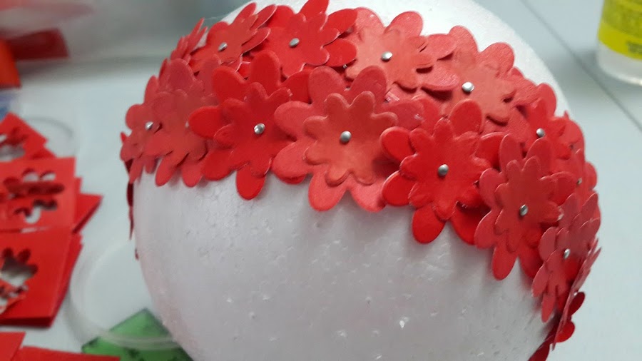 tomamos la bola de icopor y con alfileres vamos pegando las Flores por toda la superficie, yo le aplique adicionalmente una gota de silicona fría para darle mas firmeza