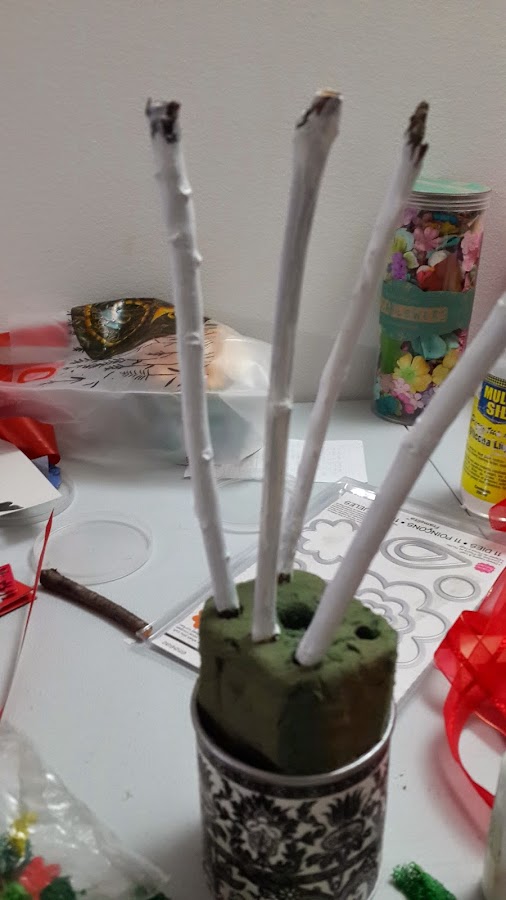una vez llena toda la bola de Flores, le enteramos un palo que será el soporte, en mi caso salí al parque, cogí una rama de un buen grosor y la pinte de blanco, pero se puede hacer con palitos de pincho o balso