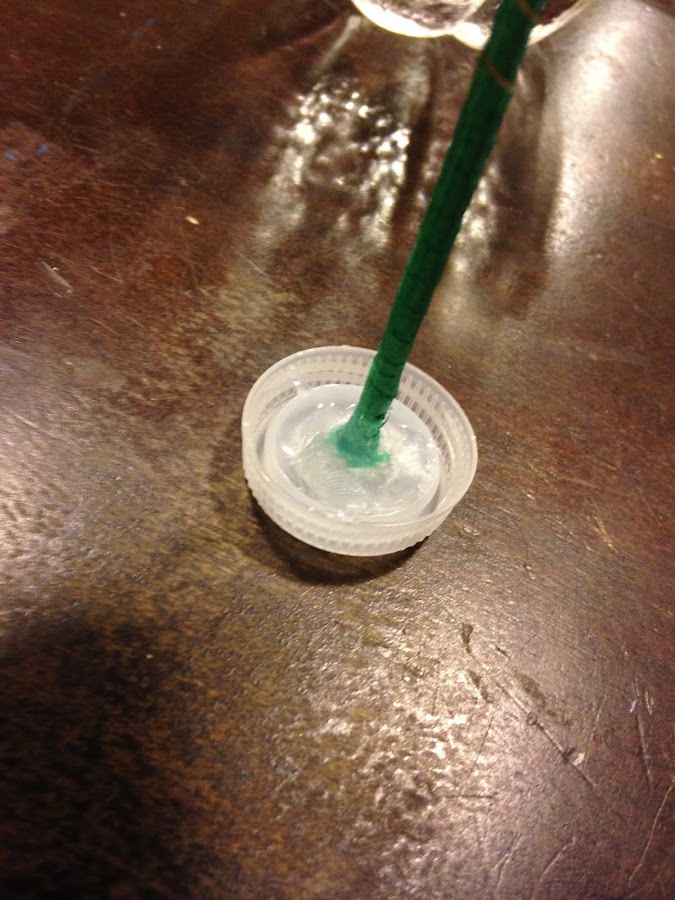 Ahora pegamos uno extremos del palito a la tapita, como base, yo recomiendo que sea el extremo plano. En el extremo de la punta, pegamos la bola de tergopol.