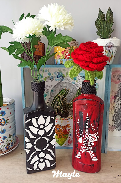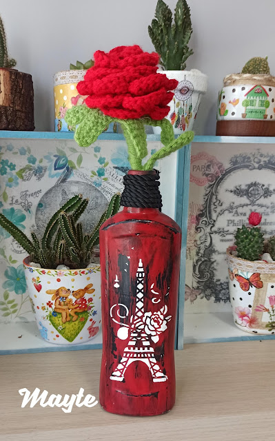 pintura negra, pasar la vela y luego la roja, stencil de París y colocar la rosa en ganchillo que hice para mi hija que iba disfrazada del Principito.