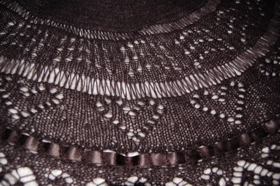 Unida a la toquilla con un pasacintas tejido a ganchillo y decorado con una cinta negra. Le hice otro pasacintas en el cuello, con otra cinta más fina, para cerrar.