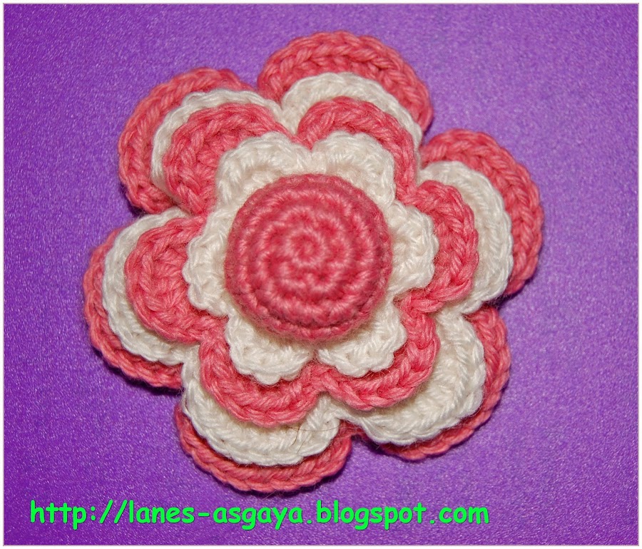 Por si acaso quería meterle algo de color, le hice otra de 2 colores, y, para variar un poco, hice una flor que vi en el blog de Mavivi, muy bien explicada, aunque ella la hace de muchos colores