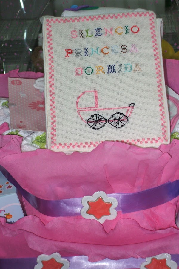 Esta es una (torre-tarta de pañales) con cartel de no molestar en punto de cruz, para una niña Está compuesta por una base de pañales de varias tallas forrados de papel pinocho y sujetos por lazos de regalo con una flor con estrella en el centro. Las flores están hechas con pasta de papel maché, extendida con un rulo entre dos plásticos duros, para que no se pegue y con la ayuda de un molde cortador se troquelan, después de secarlas se colorean, según el gusto y por último se le da una capa de barniz.