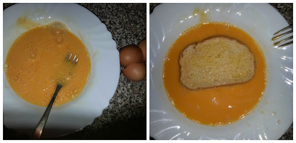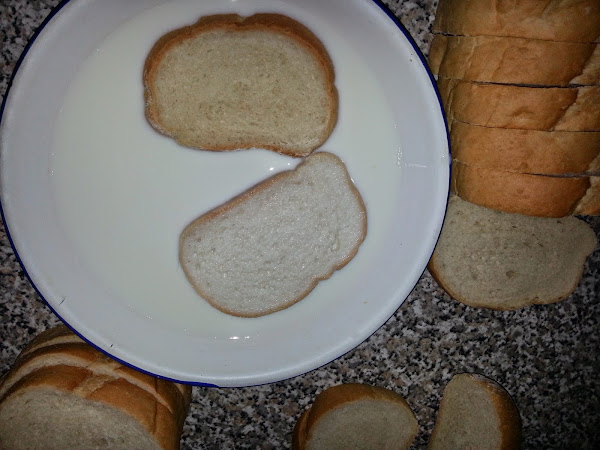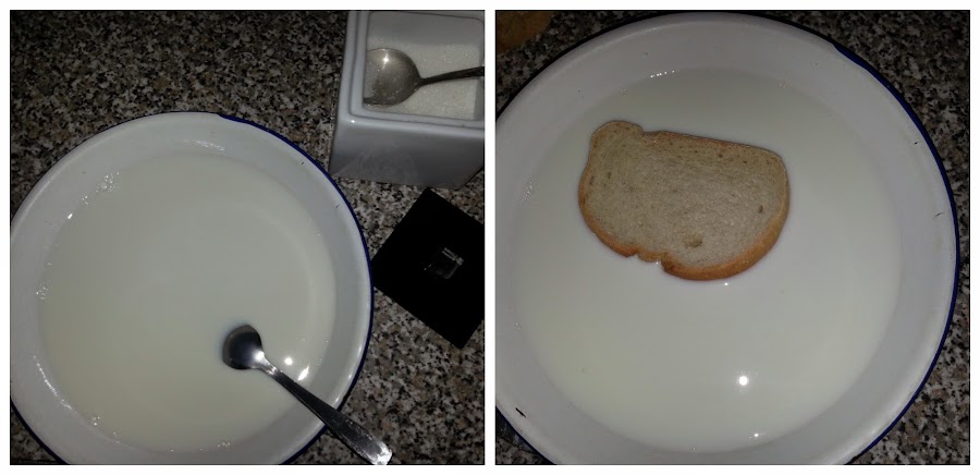 A continuación echáis leche, con azúcar (importante, que no se os olvide el azúcar....) en un plato. También podéis echarle canela si os gusta. Y empapáis las rebanadas en la leche, bien bien empapaditas....