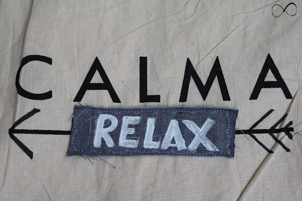 Aquí aproveché la palabra calma y tapé la de abajo y con un retal de un tejano viejo lo cosí encima y pinté a mano la palabra Relax, que creo que en su conjunto quedan bien, no crees?