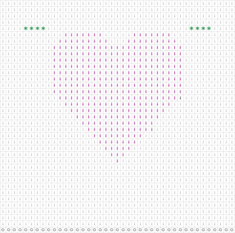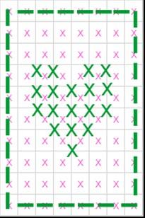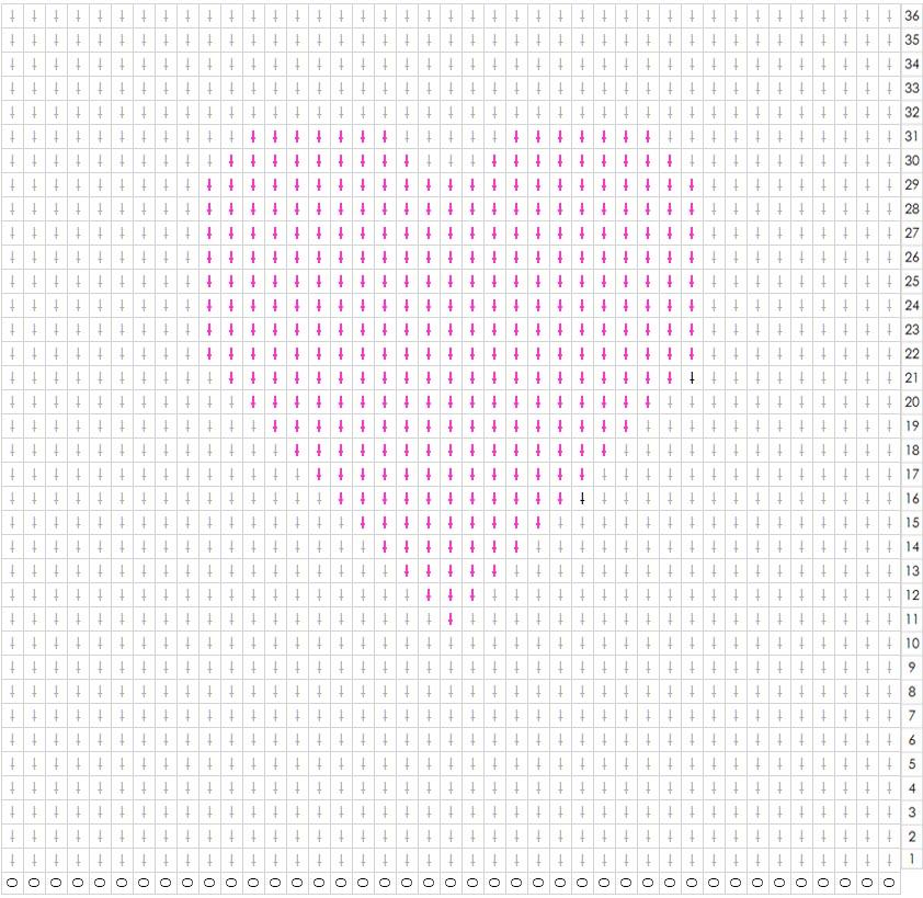 En la vuelta 11 comenzamos el corazón en color rosa fucsia. Seguimos este patrón, cambiado de color cuando corresponda, con la técnica tapestry: