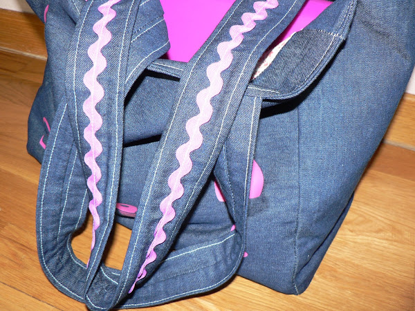 Hace unas semanas me hice una bolsa para llevar a mis clases de patronaje. Quería enseñárosla porque me encanta cómo me ha quedado. Está llena de detalles. La confeccioné en tela vaquera fuerte por fuera y algodón de patchwork por dentro.