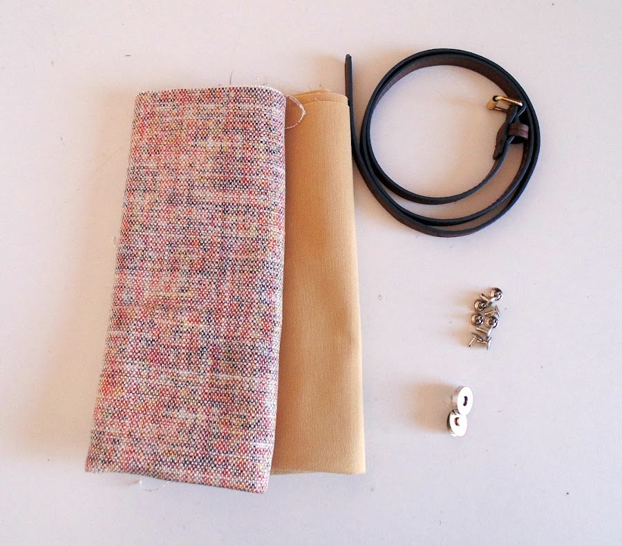 La tela utilizada para hacer este bolso es un tweed, fue un retal que compré en el mercado de los Encants, aquí en Barcelona. Las asas están hechas de un cinturón que tenía por casa.