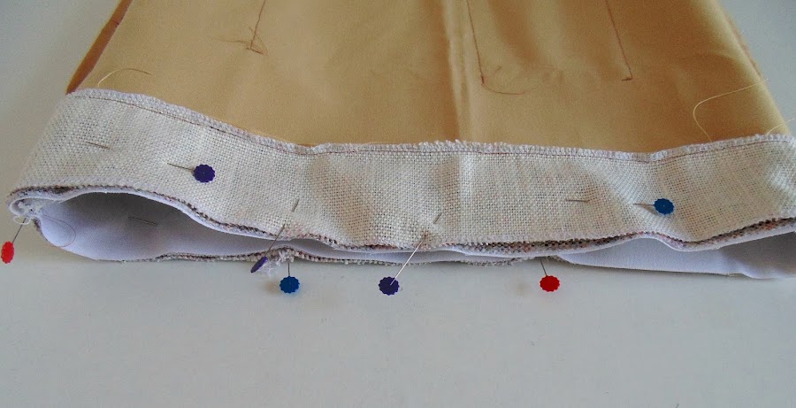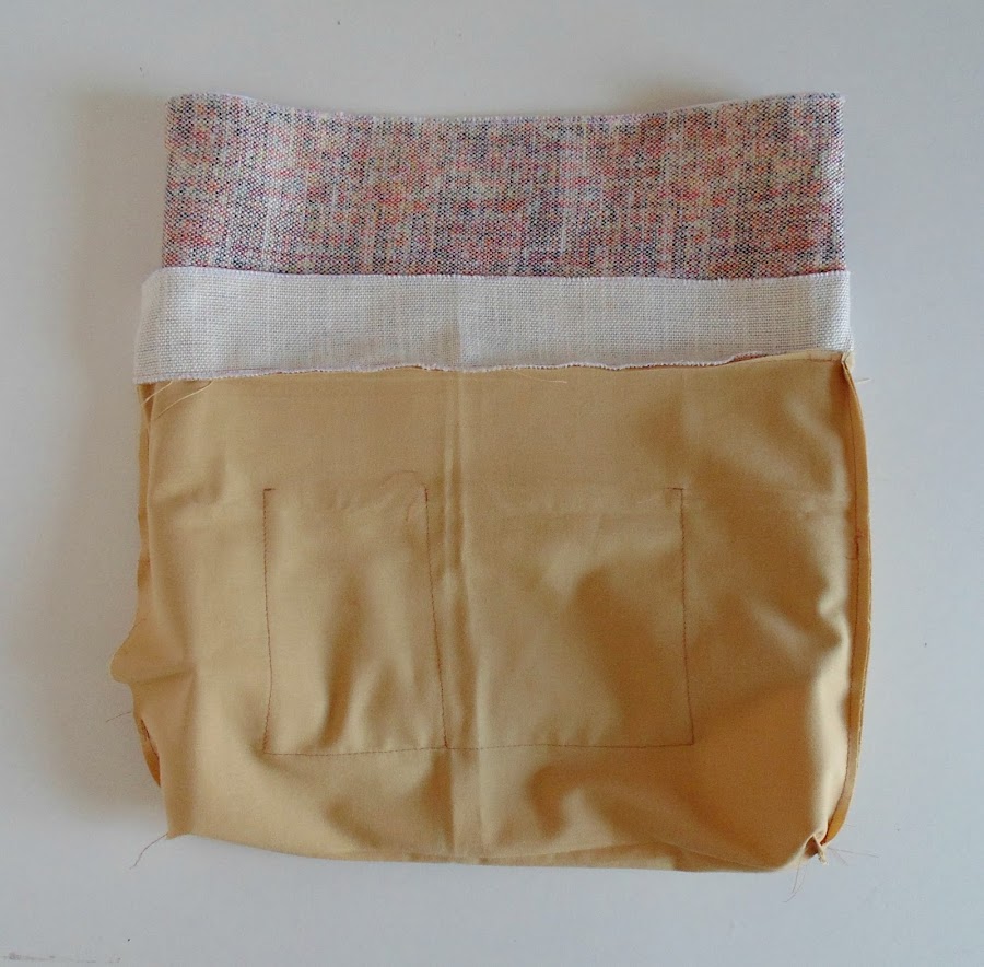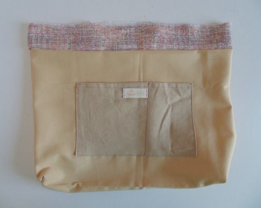 Lo mismo hice con el forro, pero en este dejé una abertura lateral para después dar la vuelta en el bolso. También al forro, cosí un bolsillo interior sencillo. Y al borde superior cosí la tira de 82cm x 6cm cortada de la tela exterior. Esta tira sirve para dar un acabado más bonito en el bolso.