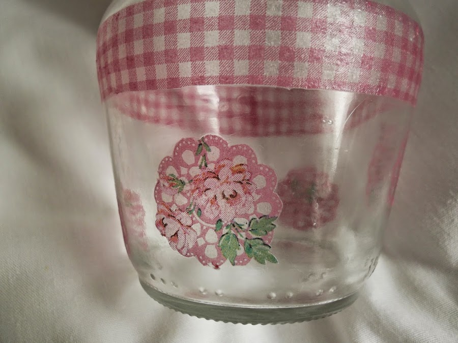 He puesto mi toque y adorné el bote de cristal haciendo un decoupage también con servilleta.
