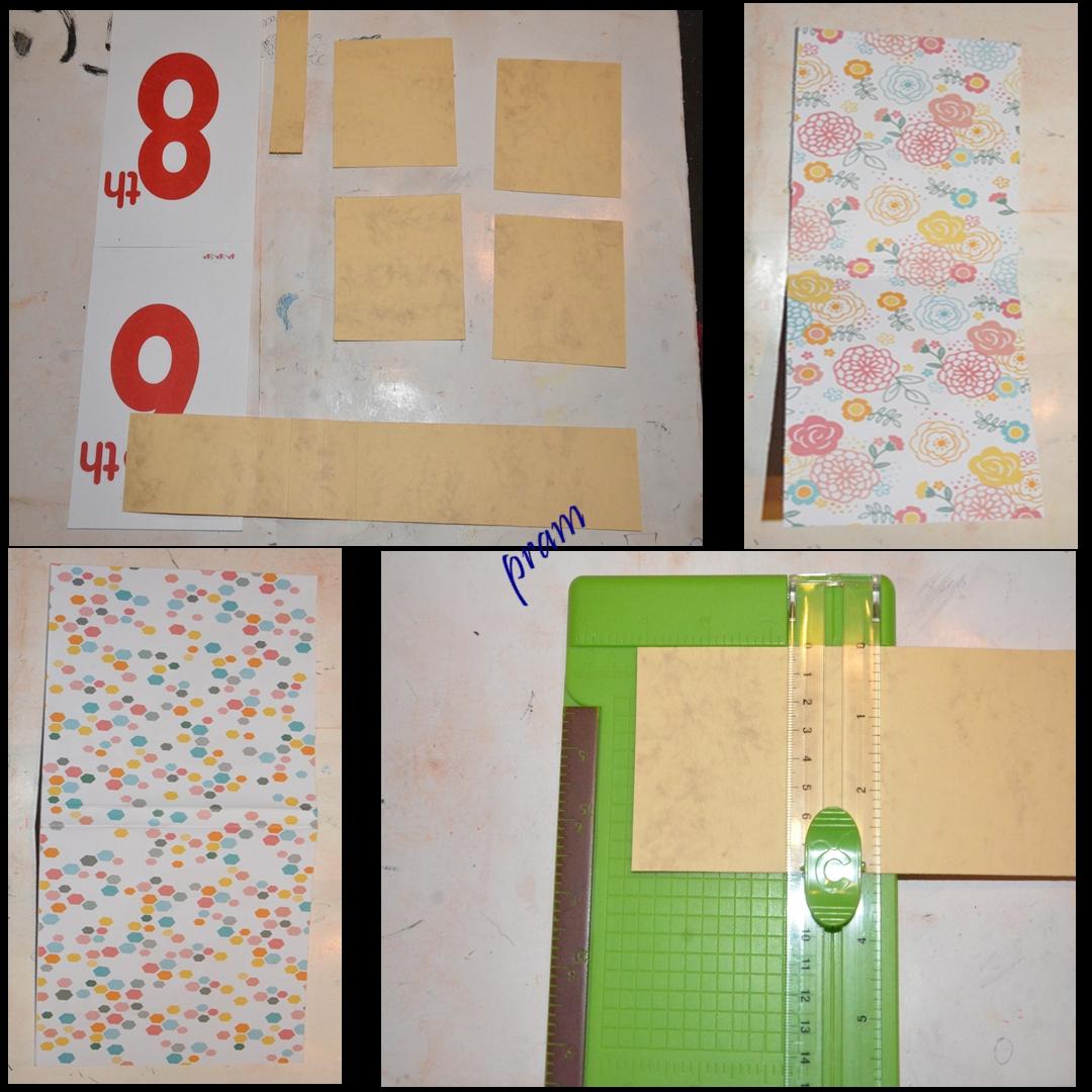 Si cortamos de estos tamaños, con una hoja de tamaño normalizado para “scrapbook” nos llega y nos sobra. En mi caso, como corté “a lo loco”, me equivoqué y tuve que repetir alguna pieza. Reciclé la pieza más grande de otra cartulina que tenía y para que no se vieran los números feos que se ven en la imagen, la forré por los dos lados con papeles decorados.