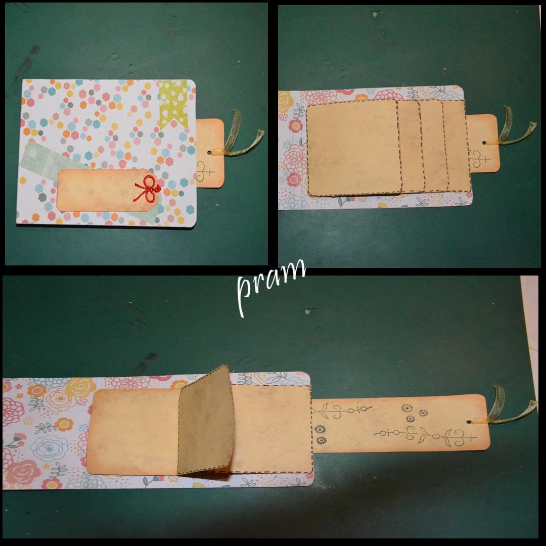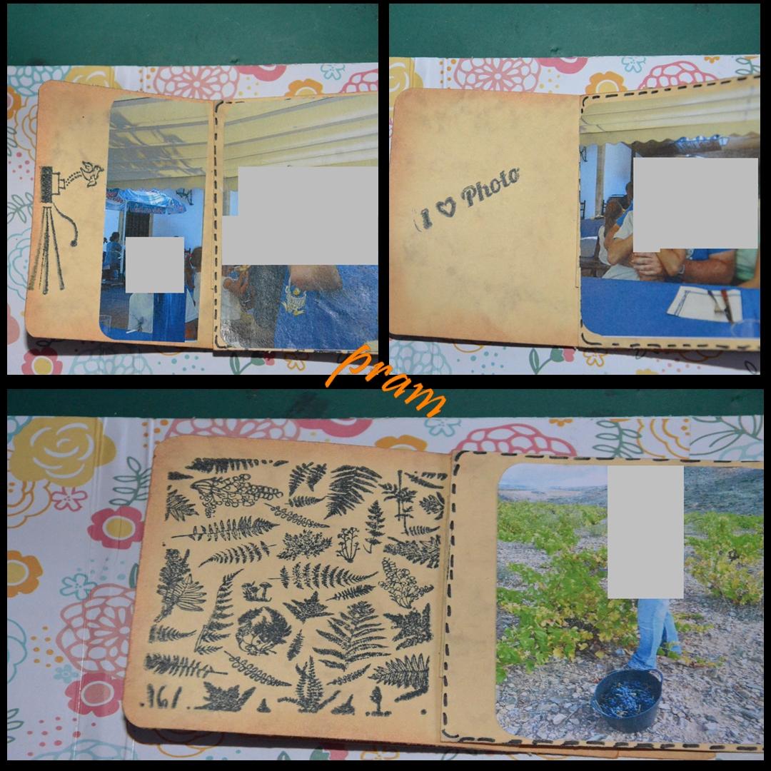 6. Redondeamos las esquinas, hacemos el agujero en la parte que sobresale y decoramos, tanto la portada como las distintas hojas del álbum en cascada y la tira de cartulina que va saliendo al estirar. Yo he dibujado un falso cosido con rotulador por un lado y por el otro he envejecido con tinta.