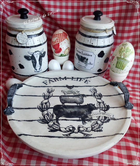 Hice decoupage con imágenes impresas y con la misma pintura pero en negro hice las manchas de vaca y un punteado.