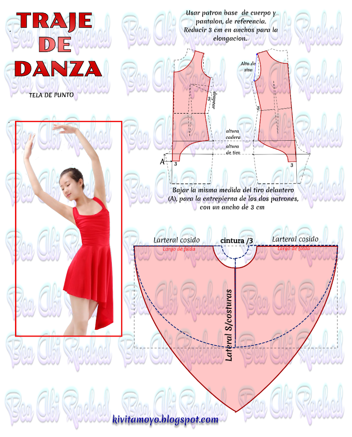 Desde el patron base a medida, dibujar este traje de maillot con falda. Se ignora la pinza de busto puesto que en el lateral se drapeara el delantero. Restar en anchos 3 cm para la elongacion del genero. La pernera sera hasta la altura de la cadera trazandola con una curva concava, para la articulacion de la ingle, indistinto del trasero que sera convexa. La linea del alto de tiro, se continua, con la medida del delantero del pantalon base (A), con un ancho de 3 cm para la entrepierna del bajo. La misma medida se repetira en la entrepierna del trasero. Se trazara una falda medio circular. Dividiendo entre 3 la medida de la cintura. En uno de sus laterales se dibujara un pico traspasando la linea del arco de la falda. Esta se aplicara a la altura de la cintura, con la costura hacia un lateral.