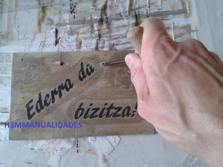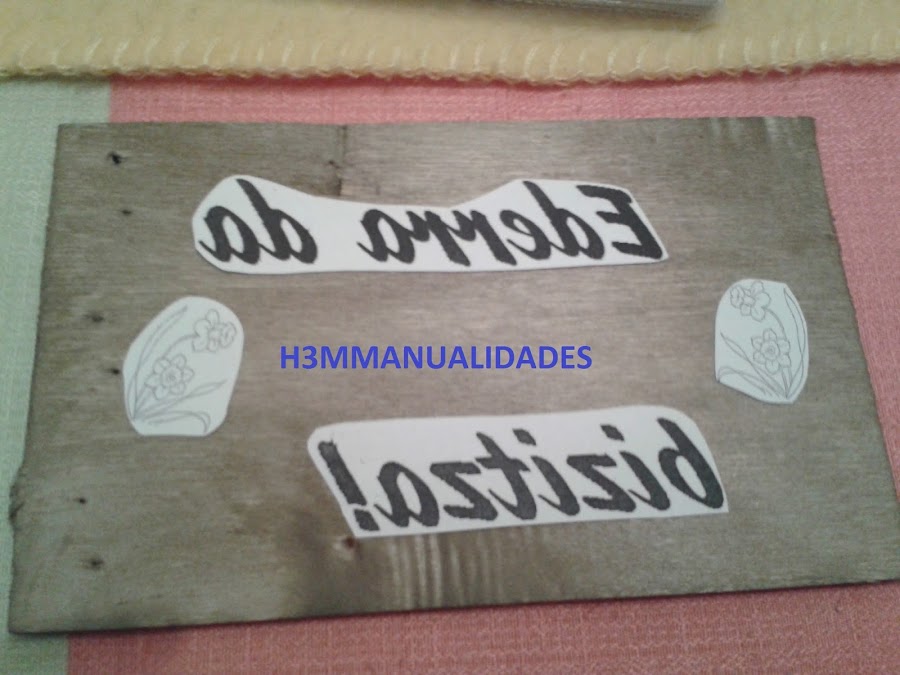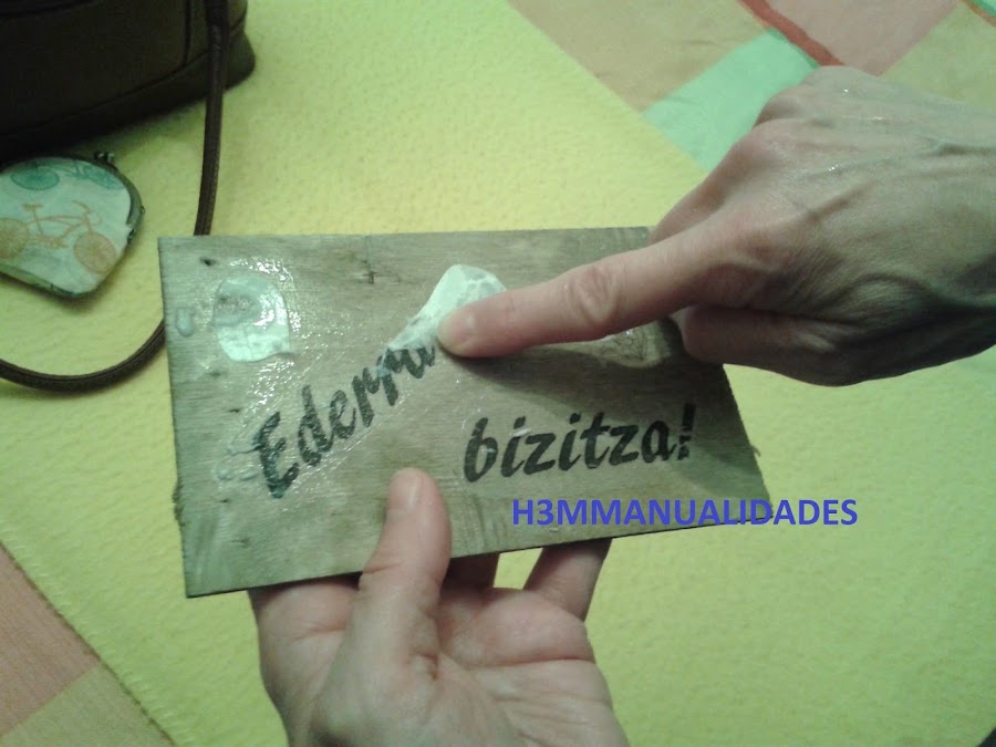 Una vez decidida la posición de cada palabra y/o motivo, se da cola para transfer sobre la madera y sobre la cara que lleva la imagen que queremos transferir. Se presiona todo bien para que pegue.